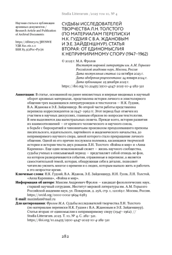 В статье, основанной на ранее неизвестных и впервые вводимых в научный оборот архивных материалах, представлена история личного и эпистолярного общения трех выдающихся литературоведов и текстологов - Н. К. Гудзия, В. А. Жданова и Э. Е. Зайденшнур. Во второй части работы представлена переписка корреспондентов за 1947-1962 гг. Этот период был отмечен их участием в научных дискуссиях, главным образом по вопросам текстологии. В нем выделяются два магистральных сюжета. Прежде всего, история развития их взаимоотношений - от крепкого человеческого и научного союза, в борьбе с бюрократией и чиновничьим произволом преодолевавшего препоны писательского, издательского, партийного и академического начальства, до непримиримого научного спора, ценой которого стало прекращение личного общения. Одной из его причин послужила полемика, касающаяся творческой истории и истории текста двух романов Л. Н. Толстого «Война и мир» и «Анна Каренина». Еще один немаловажный сюжет - жизнь научного сообщества, судьбы ученых в описываемый период - представляет собой отнюдь не фон, на котором разворачиваются события, отраженные в переписке, а является самостоятельной темой, которая, обнаруживая себя в деталях, позволяет читателю уяснить многое о времени и о людях, которым выпало жить и работать в это непростое время.