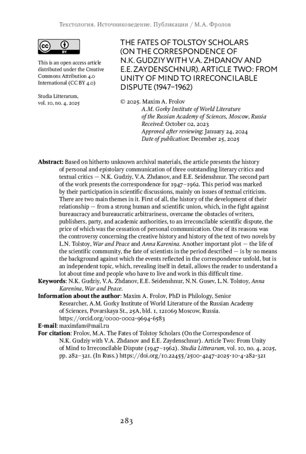 Based on hitherto unknown archival materials, the article presents the history of personal and epistolary communication of three outstanding literary critics and textual critics - N. K. Gudziy, V. A. Zhdanov, and E. E. Seidenshnur. The second part of the work presents the correspondence for 1947-1962. This period was marked by their participation in scientific discussions, mainly on issues of textual criticism. There are two main themes in it. First of all, the history of the development of their relationship - from a strong human and scientific union, which, in the fight against bureaucracy and bureaucratic arbitrariness, overcame the obstacles of writers, publishers, party, and academic authorities, to an irreconcilable scientific dispute, the price of which was the cessation of personal communication. One of its reasons was the controversy concerning the creative history and history of the text of two novels by L. N. Tolstoy, War and Peace and Anna Karenina. Another important plot - the life of the scientific community, the fate of scientists in the period described - is by no means the background against which the events reflected in the correspondence unfold, but is an independent topic, which, revealing itself in detail, allows the reader to understand a lot about time and people who have to live and work in this difficult time.