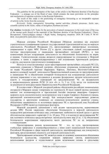 Морская доктрина Российской Федерации (Морская доктрина) как документ стратегического планирования отражает государственный стратегический взгляд на морскую деятельность Российской Федерации [1], предусматривает императивные положения, направленные в адрес МЧС России [2] и других участников единой государственной системы предупреждения и ликвидации чрезвычайных ситуаций (РСЧС), в чью компетенцию входит координация деятельности по обеспечению безопасности на морях и океанах. Геополитические основы являются определяющими по отношению к Морской доктрине, а также к корреспондирующимся с ней положениям Арктической доктрины и других документов стратегического планирования.
