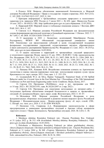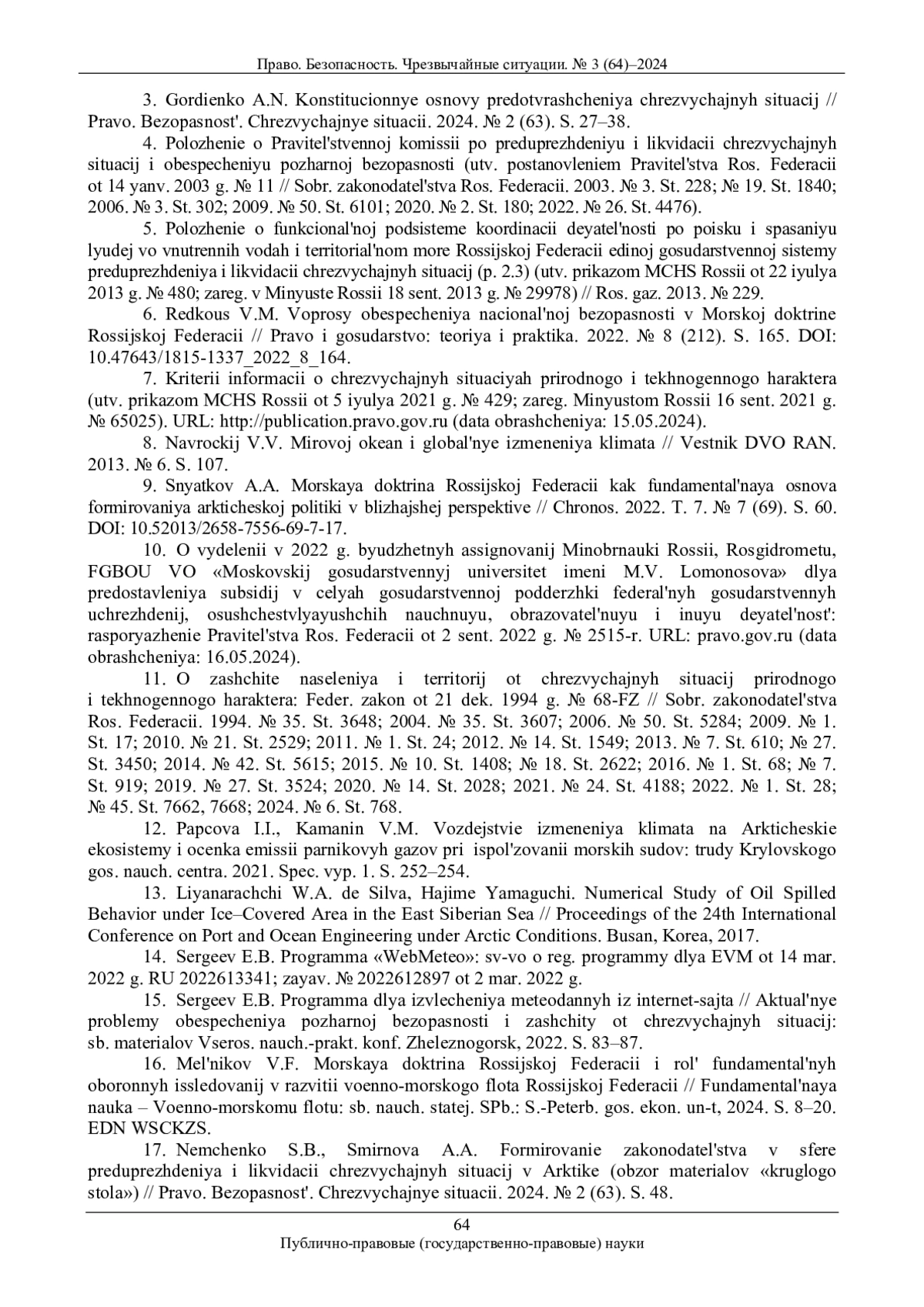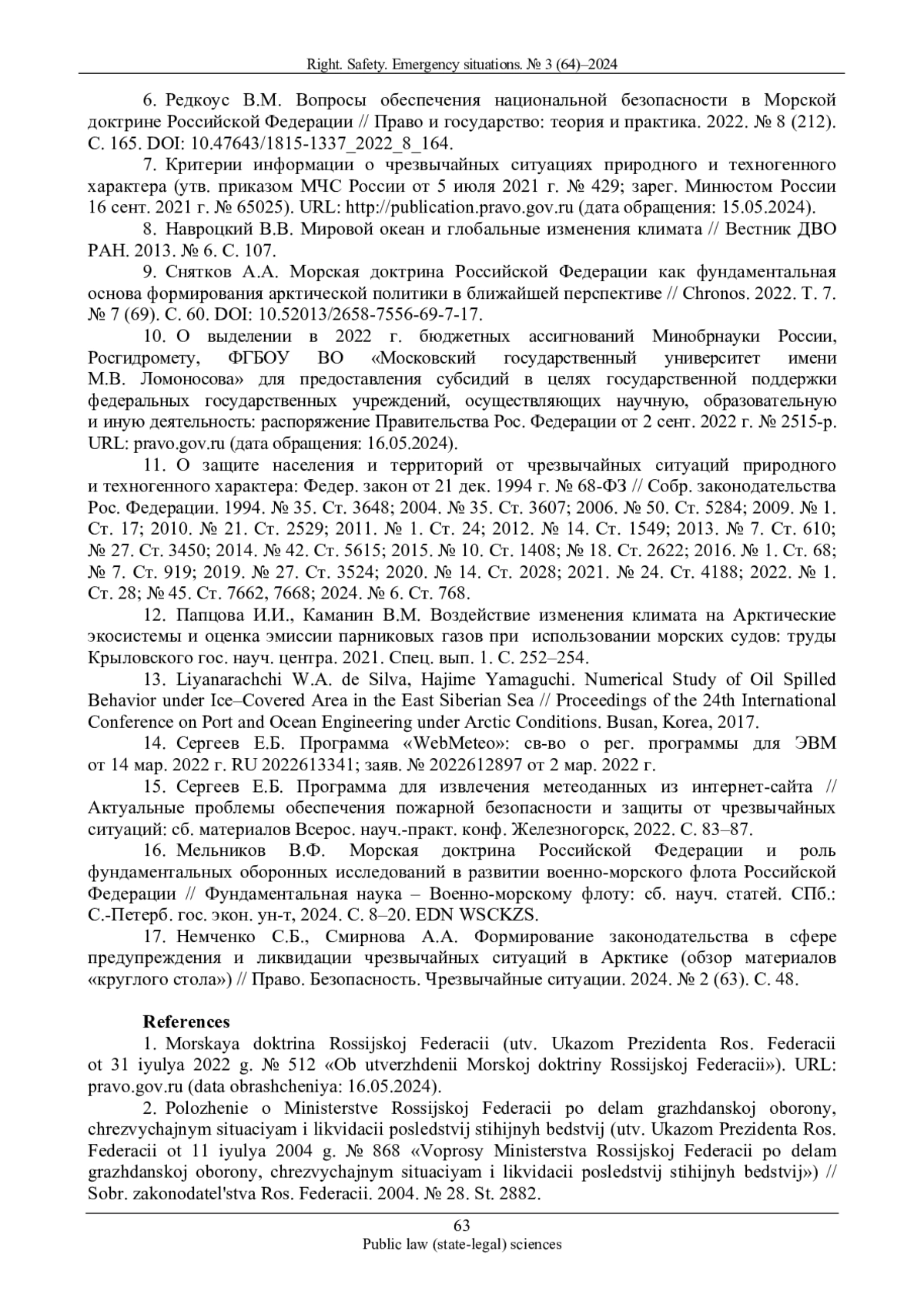 17. Немченко С.Б., Смирнова А.А. Формирование законодательства в сфере предупреждения и ликвидации чрезвычайных ситуаций в Арктике (обзор материалов “круглого стола”) // Право. Безопасность. Чрезвычайные ситуации. 2024. № 2 (63). С. 48.