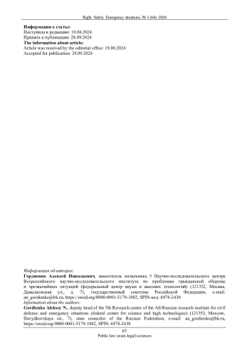 3. Гордиенко А.Н. Конституционные основы предотвращения чрезвычайных ситуаций // Право. Безопасность. Чрезвычайные ситуации. 2024. № 2 (63). С. 27-38. EDN: JRIGTH