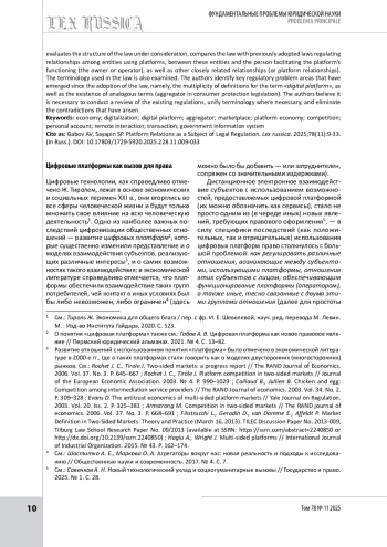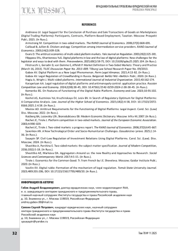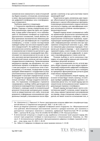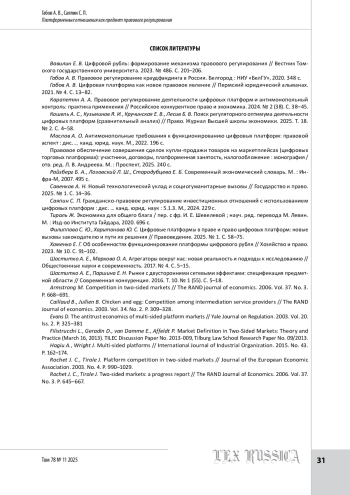 12. Филиппова С. Ю., Харитонова Ю. С. Цифровые платформы в праве и право цифровых платформ: новые вызовы законодателю и пути их решения // Правоведение. 2025. № 1. С. 58-75.