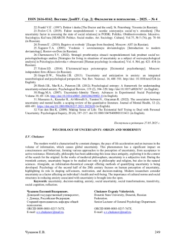 3. Белинская Е.П. Неопределенность как категория современной социальной психологии личности / Е.П. Белинская // Психологические исследования. - 2014. - Т. 7, № 36. - С. 3. EDN: THSVPT