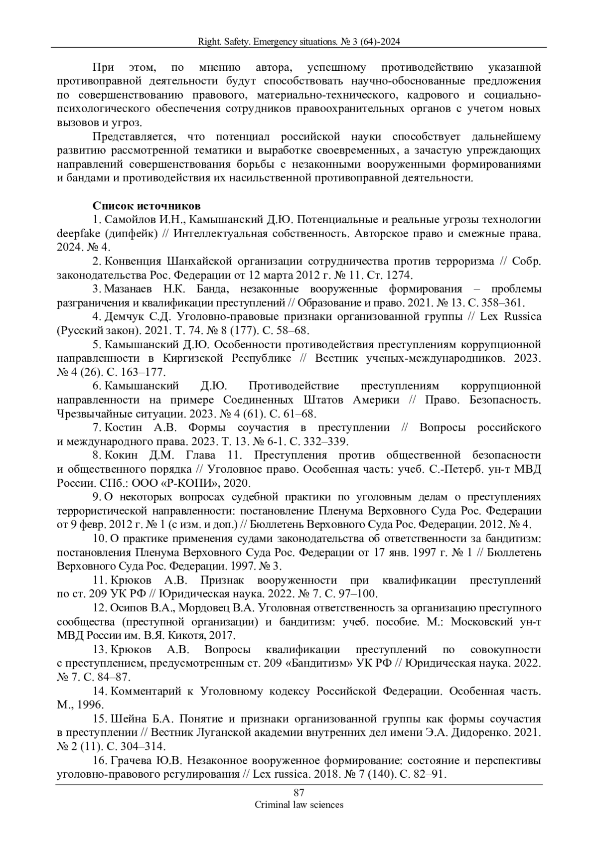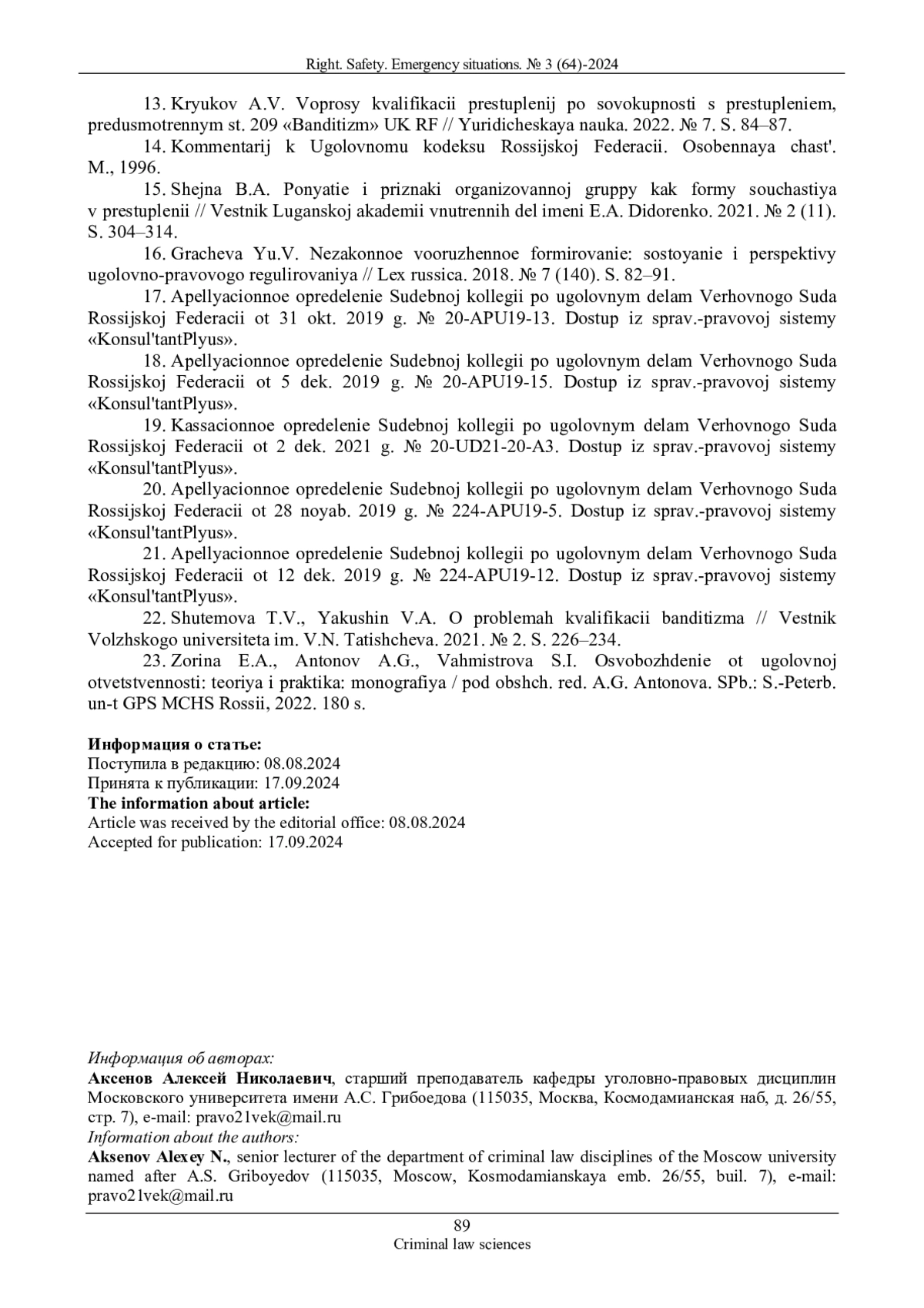 13. Крюков А.В. Вопросы квалификации преступлений по совокупности с преступлением, предусмотренным ст. 209 “Бандитизм” УК РФ // Юридическая наука. 2022. № 7. С. 84-87. EDN: WYDZQX