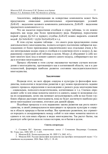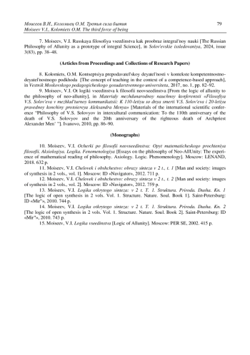 3. Моисеев В.И. Русская философия всеединства как прообраз интегральной науки // Соловьёвские исследования. 2024. Вып. 3(83). С. 38-48.
