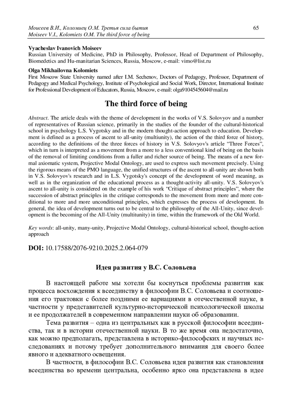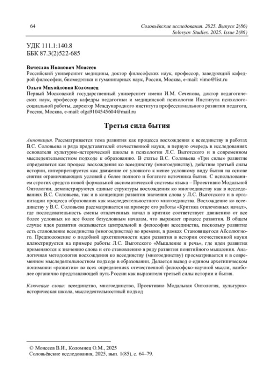 Рассматривается тема развития как процесса восхождения к всеединству в работах В. С. Соловьева и ряда представителей отечественной науки, в первую очередь в исследованиях основателя культурно-исторической школы в психологии Л. С. Выготского и в современном мыследеятельностном подходе к образованию. В статье В. С. Соловьева «Три силы» развитие определяется как процесс восхождения ко всеединству (многоединству), действие третьей силы истории, интерпретируется как движение от уловного к менее условному виду бытия на основе снятия ограничивающих условий с более полного и богатого источника бытия. С использованием строгих средств новой формальной аксиоматической системы языка - Проективно Модальной Онтологии, демонстрируются единые структуры восхождения ко многоединству как в исследованиях В. С. Соловьева, так и в концепции развития значения слова у Л. С. Выготского и в организации процесса образования как мыследеятельностного многоединства. Восхождение ко всеединству у В. С. Соловьева рассматривается на примере его работы «Критика отвлеченных начал», где последовательность смены отвлеченных начал в критике соответствует движению от все более условных ко все более безусловным началам, что выражает процесс развития. В общем случае идея развития оказывается центральной в философии всеединства, поскольку развитие есть становление всеединства (многоединства) во времени, в рамках Становящегося Абсолютного. Предположение о подобной архетипичности идеи развития в истории отечественной науки иллюстрируется на примере работы Л. С. Выготского «Мышление и речь», где идеи развития применяются к значению слова и его становлению в ряду развития понятийного мышления. Аналогичная методология восхождения ко всеединству (многоединству) просматривается и в современном мыследеятельностном подходе в образовании. Делается вывод о едином архетипическом понимании «развития» во всех определениях отечественной философско-научной мысли, наиболее органично представляющей путь России как выразителя третьей силы истории и бытия.