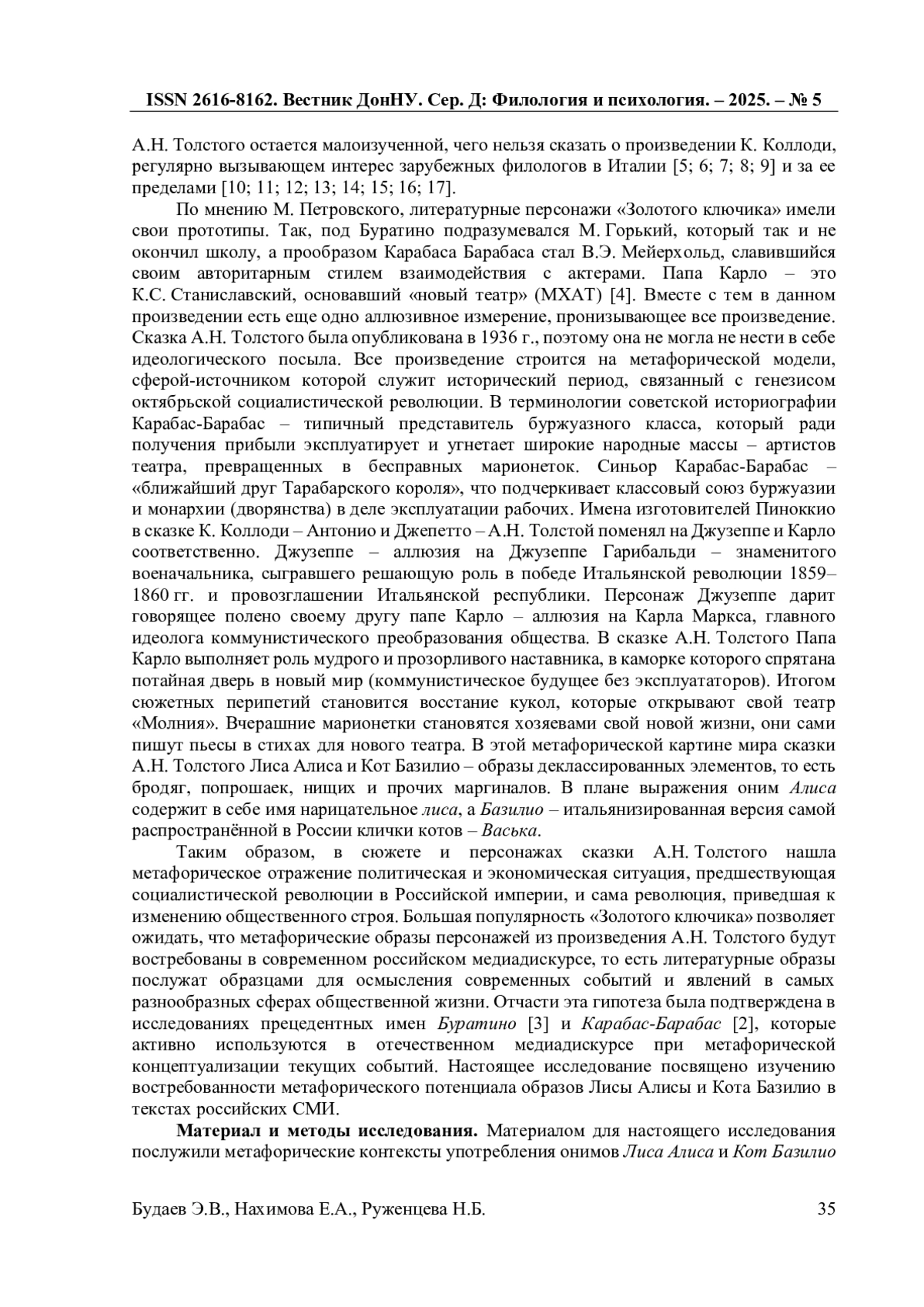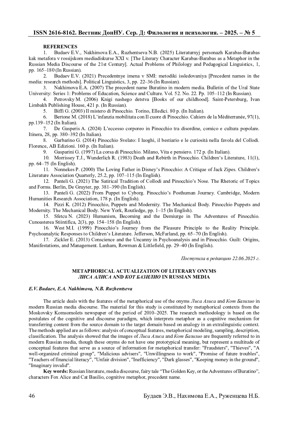1. Будаев Э.В. Литературный персонаж Карабас-Барабас как метафора в российском медиадискурсе XXI в. / Э.В. Будаев, Е.А. Нахимова, Н.Б. Руженцева // Актуальные проблемы филологии и педагогической лингвистики. - 2025. - № 1. - С. 165-180. EDN: QURWHE