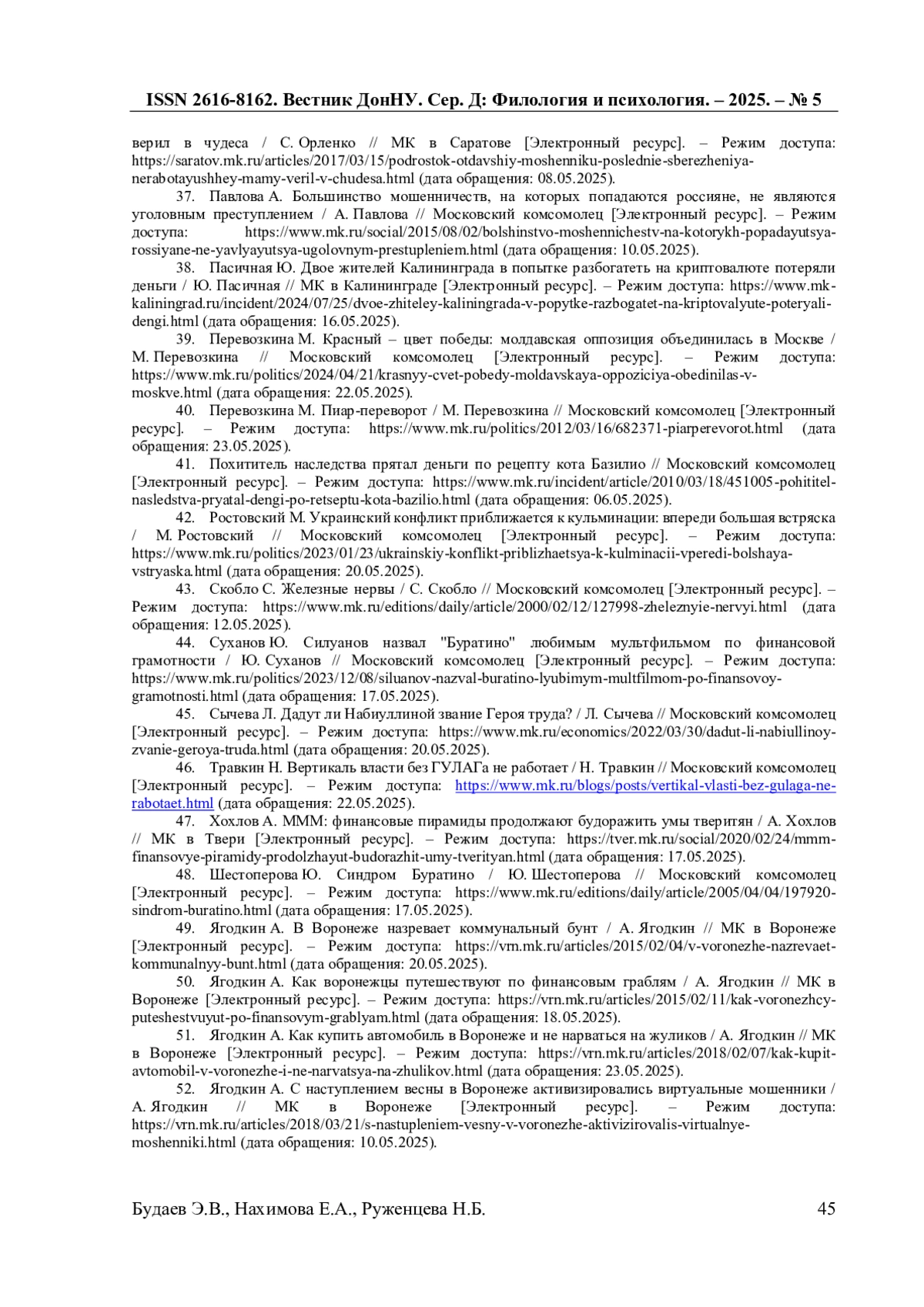 52. Ягодкин А. С наступлением весны в Воронеже активизировались виртуальные мошенники / А. Ягодкин // МК в Воронеже [Электронный ресурс]. - Режим доступа: https://vrn.mk.ru/articles/2018/03/21/s-nastupleniem-vesny-v-voronezhe-aktivizirovalis-virtualnye- moshenniki.html (дата обращения: 10.05.2025).