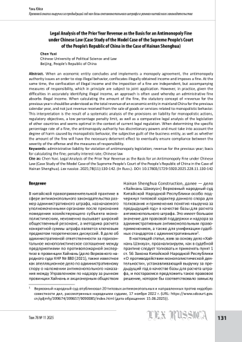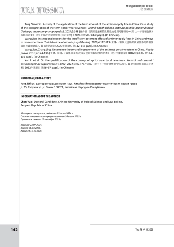 11. Янь Ли [и др.]. Об определении понятия «общая выручка за предыдущий год» // Контроль над ценами и антимонопольное регулирование в Китае. 2022. № 5. С. 56-57 (严励等:《关于上一年度销售额»的认定》,载《中 国价格监管与反垄断》2022年第5期,第56-57页).