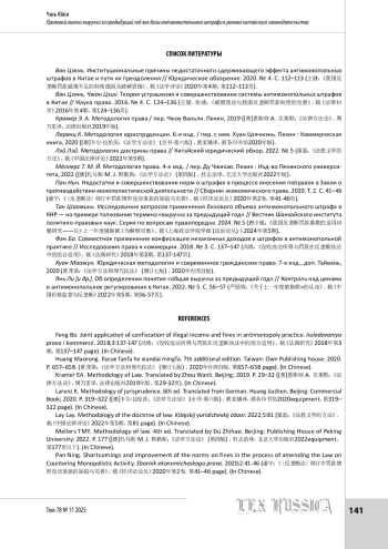 1. Ван Цзянь. Институциональные причины недостаточного сдерживающего эффекта антимонопольных штрафов в Китае и пути их преодоления // Юридическое обозрение. 2020. № 4. С. 112-113 (王健:《我国反 垄断罚款威慑不足的制度成因及破解思路》,载《法学评论》2020年第4期,第112-113页).