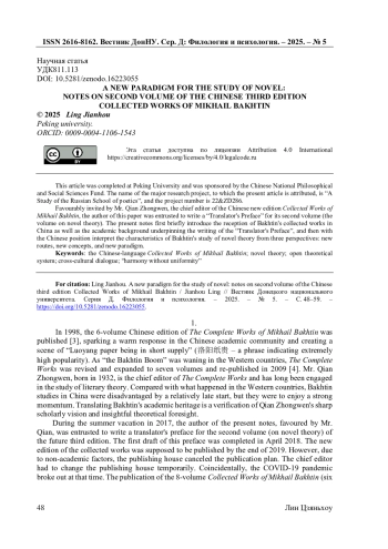 Эта статья была написана в Пекинском университете при финансовой поддержке Китайского национального фонда философских и социальных наук. Крупный исследовательский проект, к которому относится настоящая статья, называется “Исследование русской поэтической школы”, а номер проекта - 22&ZD286. По благосклонному приглашению г-на Цянь Чжунвэня, главного редактора китайского нового издания Собрания сочинений Михаила Бахтина, автору этой статьи было поручено написать “Переводческое предисловие” ко второму тому (тому, посвященному теории романа). В настоящих заметках сначала кратко рассказывается о восприятии собрания сочинений Бахтина в Китае, а также об академической подготовке, лежащей в основе написания “Предисловия переводчика”, а затем, с позиции Китая, интерпретируются особенности бахтинского исследования теории романа с трех точек зрения: новые маршруты, новые концепции и новые возможности парадигмы.