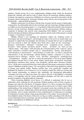 1. Bakhtin M.M. (1975) Problems of Literature and Aesthetics. Moscow: “Artistic literature” Publishing House (in Russian).