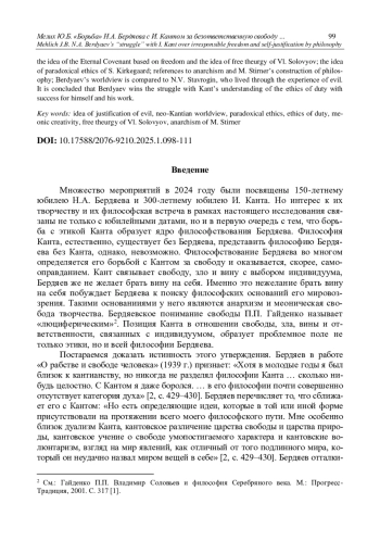 Актуальность исследования связана с 300-летним юбилеем И. Канта и 150-летним юбилеем Н. А. Бердяева. Новизна исследования состоит в обосновании тезиса о том, что «борьба» Бердяева с Кантом составляет основной мотив и ядро его философствования. Осуществляется компаративный анализ философствования Бердяева, в ходе которого устанавливаются сходства и различия его идей с идеями других философов. В ракурсе внимания оказываются бердяевская идея Вечного Завета, основанного на свободе, и идея свободной теургии Вл. Соловьева; идея парадоксальной этики С. Кьеркегора и идея анархизма М. Штирнера. Мировоззрение Бердяева сравнивается с мирровоззрением героя Ф. М. Достоевского Н. В. Ставрогина, пережившего опыт зла. Делается вывод о том, что Бердяев с успехом для себя и своего творчества одерживает победу в борьбе с кантовским пониманием этики долга.