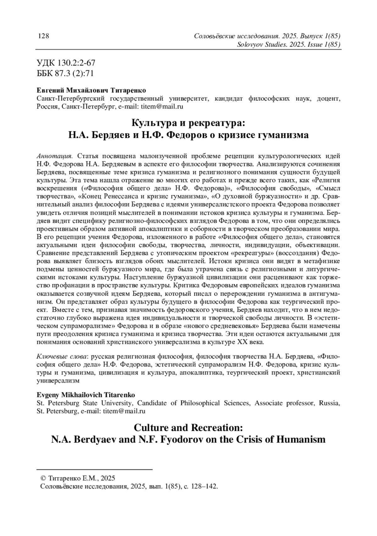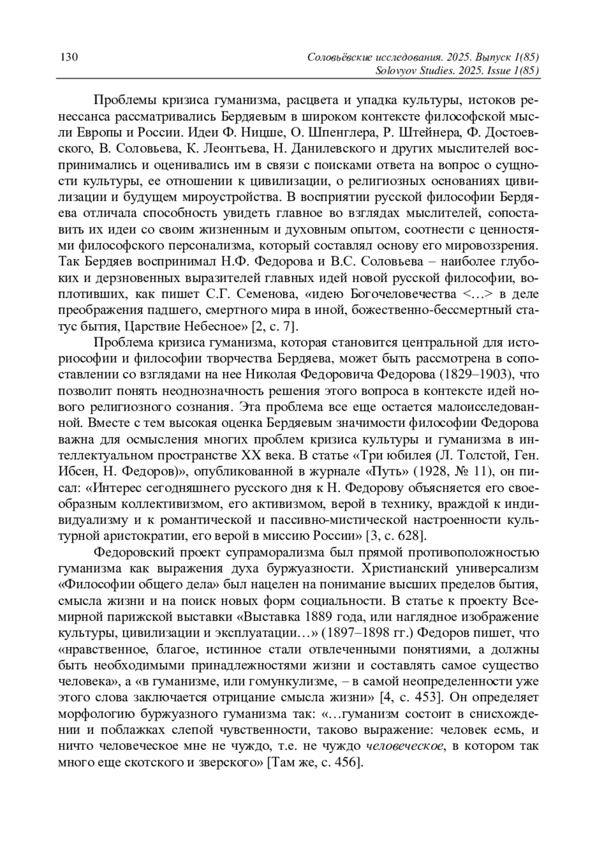 Статья посвящена малоизученной проблеме рецепции культурологических идей Н. Ф. Федорова Н. А. Бердяевым в аспекте его философии творчества. Анализируются сочинения Бердяева, посвященные теме кризиса гуманизма и религиозного понимания сущности будущей культуры. Эта тема нашла отражение во многих его работах и прежде всего таких, как «Религия воскрешения («Философия общего дела» Н. Ф. Федорова)», «Философия свободы», «Смысл творчества», «Конец Ренессанса и кризис гуманизма», «О духовной буржуазности» и др. Сравнительный анализ философии Бердяева с идеями универсалистского проекта Федорова позволяет увидеть отличия позиций мыслителей в понимании истоков кризиса культуры и гуманизма. Бердяев видит специфику религиозно-философских взглядов Федорова в том, что они определялись проективным образом активной апокалиптики и соборности в творческом преобразовании мира. В его рецепции учения Федорова, изложенного в работе «Философия общего дела», становятся актуальными идеи философии свободы, творчества, личности, индивидуации, объективации. Сравнение представлений Бердяева с утопическим проектом «рекреатуры» (воссоздания) Федорова выявляет близость взглядов обоих мыслителей. Истоки кризиса они видят в метафизике подмены ценностей буржуазного мира, где была утрачена связь с религиозными и литургическими истоками культуры. Наступление буржуазной цивилизации они расценивают как торжество профанации в пространстве культуры. Критика Федоровым европейских идеалов гуманизма оказывается созвучной идеям Бердяева, который писал о перерождении гуманизма в антигуманизм. Он представляет образ культуры будущего в философии Федорова как теургический проект. Вместе с тем, признавая значимость федоровского учения, Бердяев находит, что в нем недостаточно глубоко выражена идея индивидуальности и творческой свободы личности. В «эстетическом супраморализме» Федорова и в образе «нового средневековья» Бердяева были намечены пути преодоления кризиса гуманизма и кризиса творчества. Эти идеи остаются актуальными для понимания оснований христианского универсализма в культуре XX века.