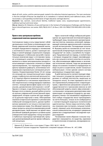 В статье исследуется центральная проблема современности — диалектическое соотношение права и силы. Автор критикует либеральную парадигму, которая редуцирует данное соотношение к оппозиции (антагонизму), сводя (в конечном счете) право к инструменту защиты индивидуальной свободы, а силу — к угрозе. Такой подход, по мнению автора, ведет к кризису правопонимания, разрыву между формальным законом и глубинными правовыми устоями, а также утрате государством субъектности и коллективных целей. В противовес этому предлагается рассмотреть право и силу как взаимозависимые начала: право нуждается в силе для обеспечения своей исполнимости, а сила — в праве для своей легитимации. Ключ к их гармоничному синтезу автор видит в учете национального социокультурного контекста. На примере российской традиции демонстрируется модель правового овладения силой, где право призвано не просто ограничивать власть, но и одухотворять ее, подчиняя высшим идеалам правды, справедливости и общего блага, укорененным в коллективном историческом опыте. Основной вывод заключается в том, что сила российского права зависит от его укорененности в национальной идентичности и традиционных ценностях, что требует соответствующей трансформации юридического образования и правовой доктрины.