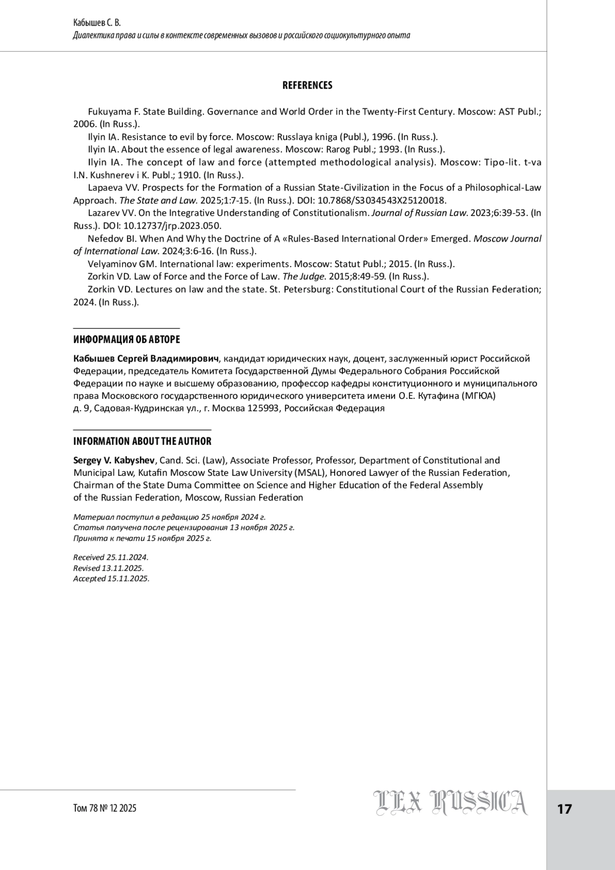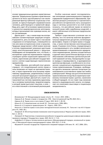 8. Лапаева В. В. Перспективы становления российского государства-цивилизации в фокусе философскоправового подхода // Государство и право. 2025. № 12. С. 7-15.