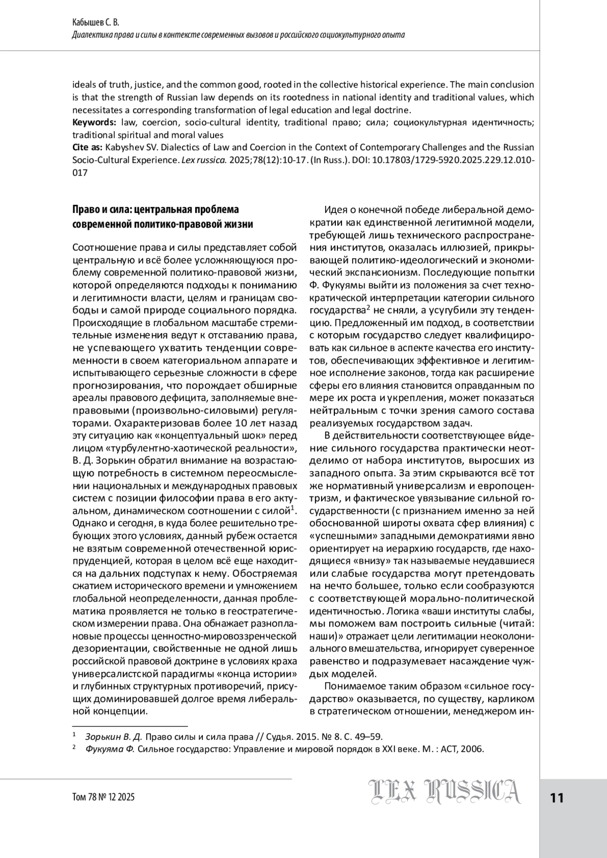 3. Зорькин В. Д. Право силы и сила права // Судья. 2015. № 8. С. 49-59.