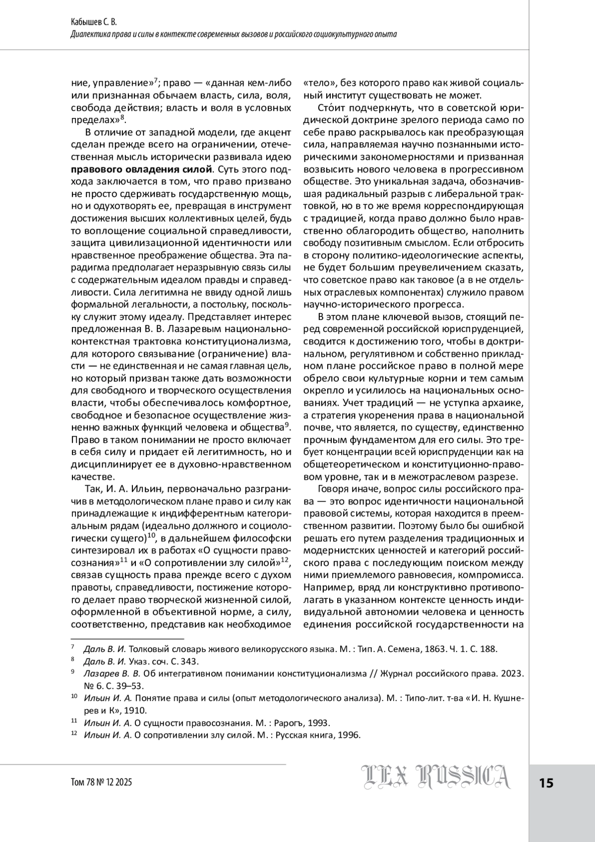 7. Лазарев В. В. Об интегративном понимании конституционализма // Журнал российского права. 2023. № 6. С. 39-53.