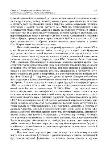 На заседаниях прозвучали более 160 докладов, подготовленных российскими и зарубежными учеными, в которых была представлена широкая пано-рама духовных и творческих исканий русских писателей и мыслителей, связанных с рефлексией о будущем. Наибольшее число выступлений было посвящено культуре Серебряного века, где трактовка будущего была тесно связана с религиозно философской и эстетической проблематикой, и эпохе 1920-1930 х годов, стремившейся к осмыслению революционного перелома, будущего России и Европы, выстраивавшей свои модели нового мира и нового человека. Обе эти эпохи объединяет «эсхатологическое беспокойство», взыскание целостного идеала, Царства Божия на земле и одновременно острое сознание «небратского» состояния мира, разрыва между наличным и должным, невозможности рая при существовании страдания, болезни и смерти.