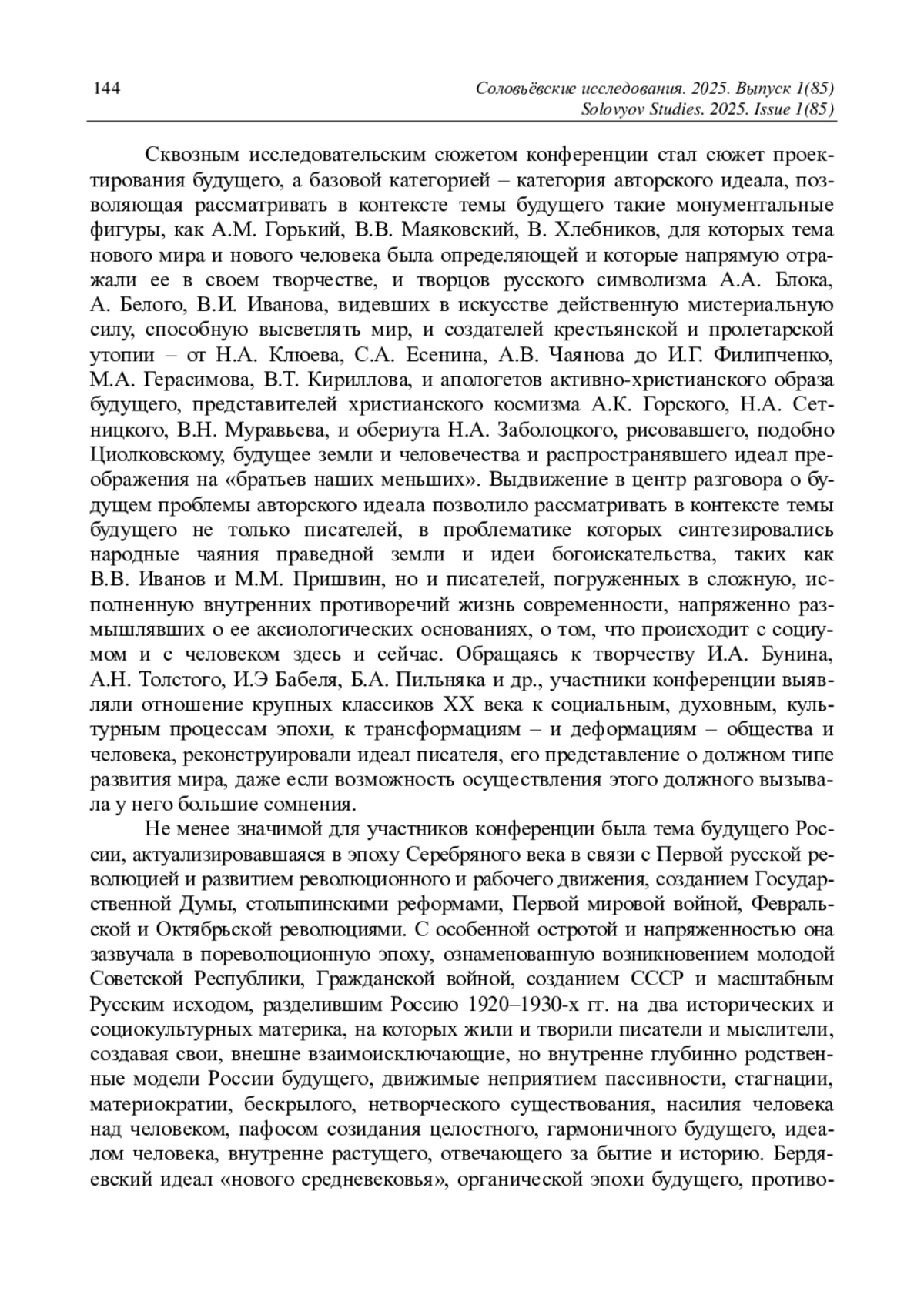 4-7 октября 2023 года в Москве прошла Международная научная конференция «Образ будущего в русской литературе XX XXI вв.». Ее организаторами выступили Институт мировой литературы имени А. М. Горького РАН, Литературный институт имени А. М. Горького, Ассоциация музеев космонавтики России и Библиотека № 180 им. Н. Ф. Федорова ОКЦ ЮЗАО г. Москвы. Журнал «Соловьёвские исследования» стал партнером конференции.
