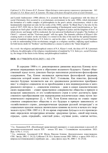 На доказательных основаниях вводится ранее неизвестный источник религиозно-философских представлений Клюева - сочинение идеолога социального христианства Ф.-Р. Ламенне «Слова верующего» ( Paroles d’un croyant ). Выявлено, что в свою статью 1919 г. «Красный набат» Клюев включил практически без изменений главы 35 и 36 этого текста в переводе братьев Владимира и Леонида Андроусонов (издание 1906 г.). Сделано предположение о первом знакомстве Клюева с идеями социального христианства в революционной среде в начале 1900-х гг., что определило формирование в художественном сознании поэта устойчивой системы представлений, которая принципиально важна для понимания его произведений 1900-1910-х гг.: это, прежде всего, понимание коренных общественных преобразований как «участия в плане Бога» и представление о будущем как о «царстве справедливости и царстве любви», в котором рабство и голод будут искоренены, утраченное всеобщее братство людей («братьев Христа») восстановлено и «народ-богочеловек» воскреснет. Раскрыта драматическая коллизия жизнетворческого мифа Н. А. Клюева: с одной стороны, он укоренен в восходящем к Вл. С. Соловьеву представлении о необходимости духовного преображения человечества, а с другой - в идеологии социального христианства с его пониманием революционной борьбы как религиозной жертвы, подразумевающей равную готовность как к героической смерти за «братьев», так и к кровопролитию как средству достижения «будущего царства».