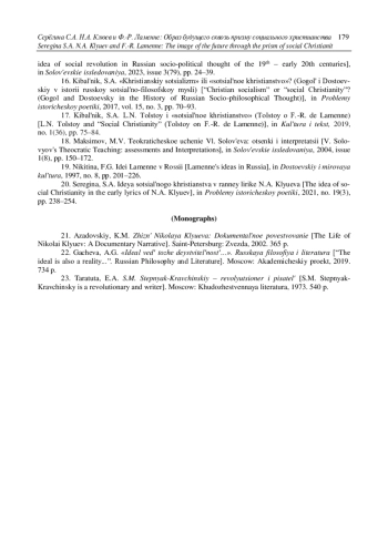 11. Серегина С.А. Идея социального христианства в ранней лирике Н.А. Клюева // Проблемы исторической поэтики. 2021. № 19(3). С. 238-254.