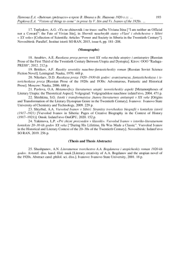 21. Шушпанов А.Н. Литературное творчество А.А. Богданова и утопический роман 1920-х годов: автореф. дис. … канд. филол. наук. Иваново: Иван. гос. ун-т, 2001. 18 с.