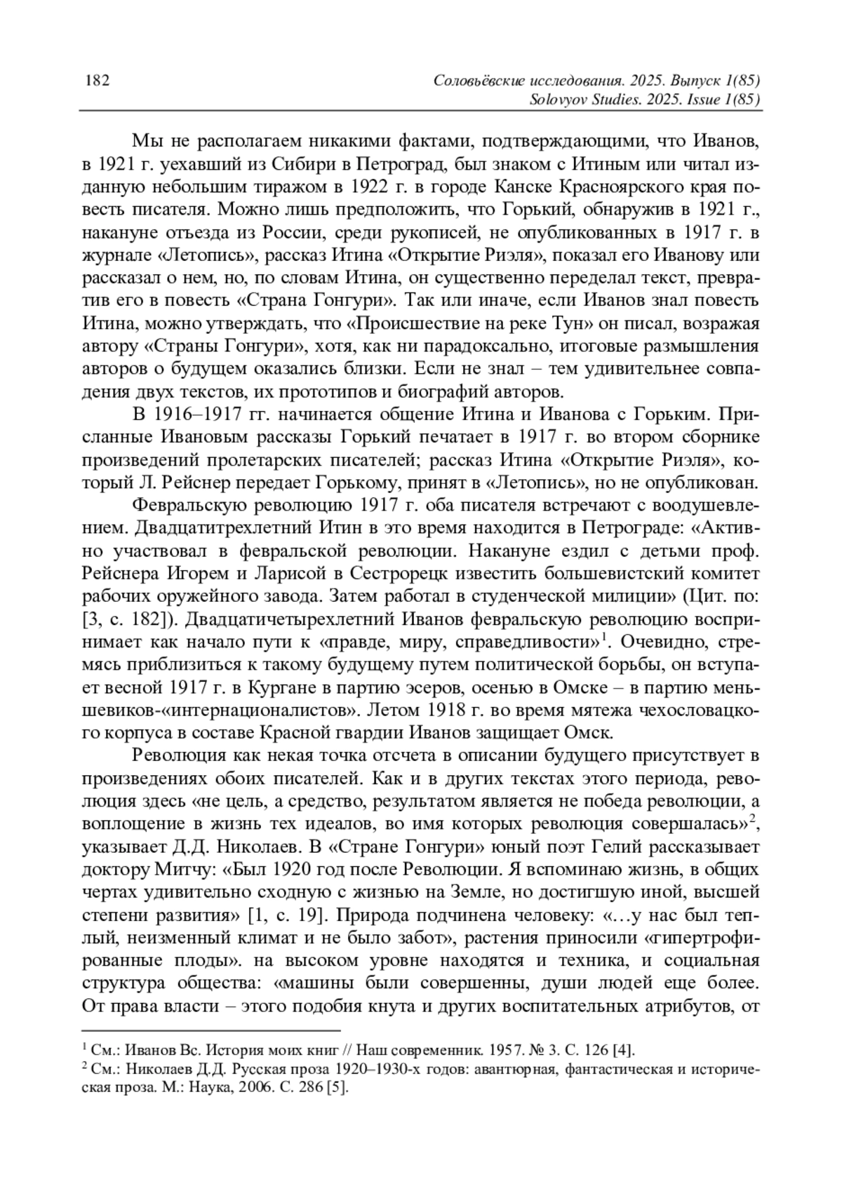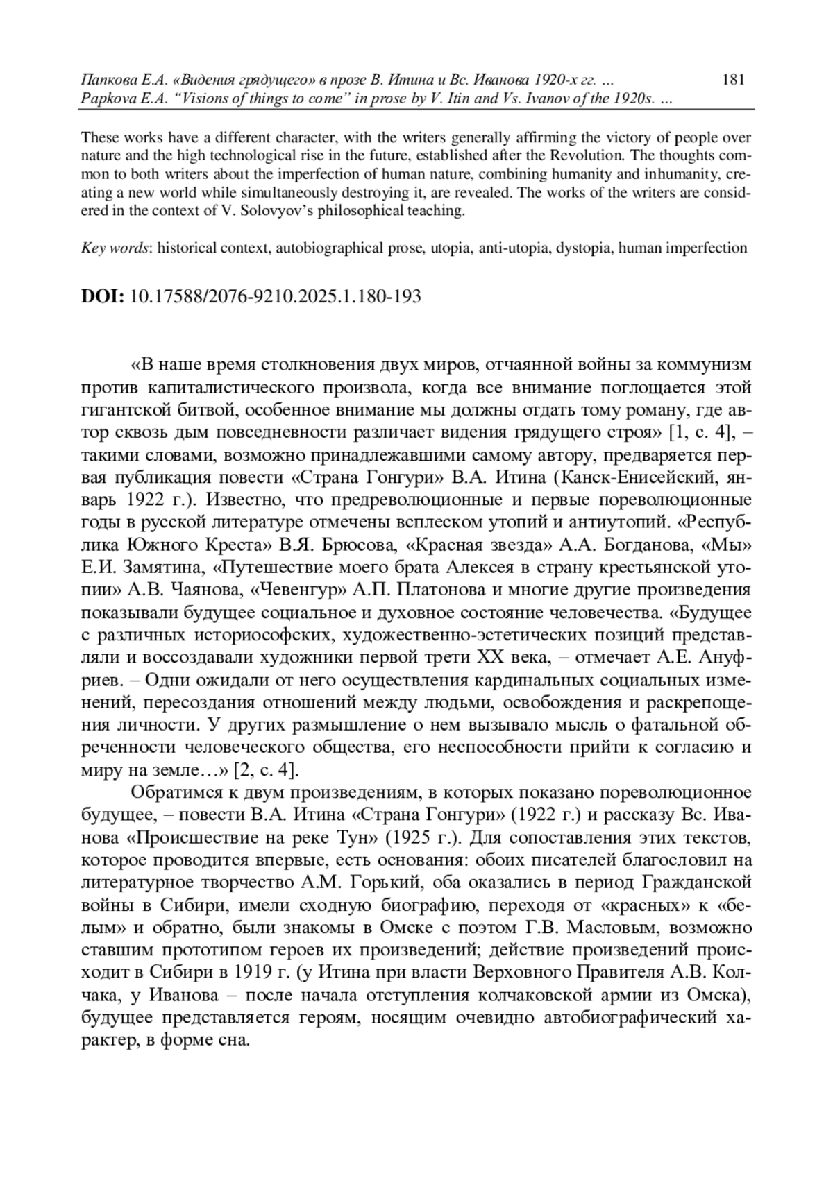 Впервые сопоставляются произведения В. Итина «Страна Гонгури» и Вс. Иванова «Происшествие на реке Тун», в которых решается неизменно актуальная проблема будущего человечества. Для подтверждения обоснованности сопоставления текстов дается обзор фактов биографий и творчества обоих писателей конца 1910 - начала 1920-х гг., показывающий обусловленность проблематики их произведений биографическими фактами. На материале двух текстов с использованием сравнительно-исторического и сравнительно-типологического методов обосновывается автобиографический характер героев произведений, перед которыми во сне являются видения грядущего. Изложена гипотеза о возможном прототипе героев рассказа и повести - поэте Г. В. Маслове. Анализируются и сопоставляются созданные Ивановым и Итиным дистопия и утопия, которые имеют различный характер, но при общем утверждении победы людей над природой и высокого технического взлета в будущем, утвердившемся после Революции. Выявлены общие для двух писателей мысли о несовершенной природе людей, соединяющих в себе человечность и бесчеловечность, создающих новый мир и одновременно разрушающих его. Искания писателей рассмотрены в контексте философского учения В. Соловьева.