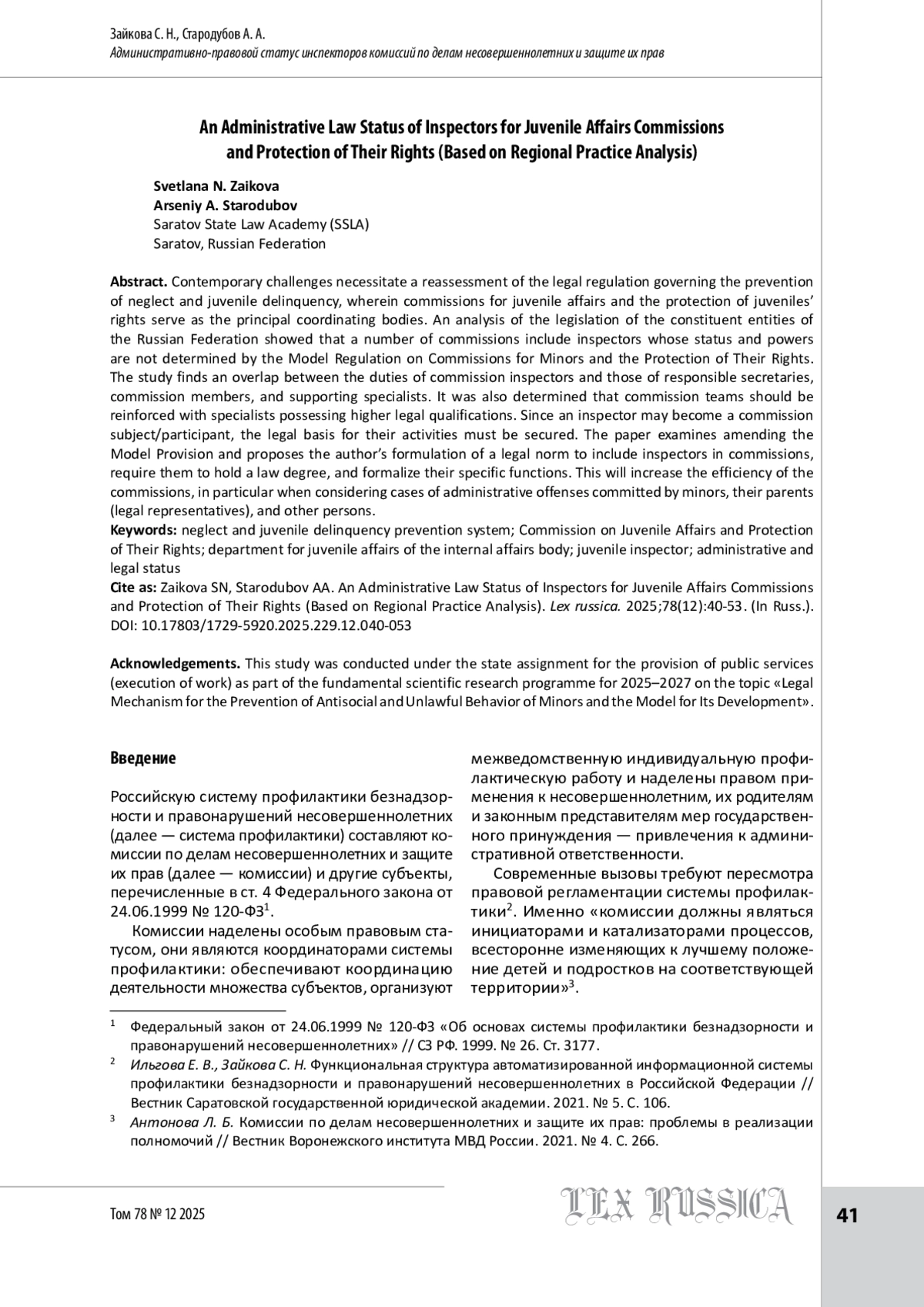 Современные вызовы требуют пересмотра правовой регламентации системы профилактики безнадзорности и правонарушений несовершеннолетних, ключевую координирующую роль в которой играют комиссии по делам несовершеннолетних и защите их прав. Анализ законодательства субъектов Российской Федерации показал, что в состав ряда комиссий включены инспектора, чей статус и полномочия не определены Примерным положением о комиссиях по делам несовершеннолетних и защите их прав. В работе делается вывод о том, что имеет место смешение функций инспекторов комиссий с функциями ответственных секретарей, членов комиссий и специалистов, обеспечивающих деятельность комиссий. В то же время выявлена потребность в усилении команд комиссий специалистами, имеющими высшее юридическое образование. Именно инспектор может стать тем субъектом комиссии, за которым необходимо закрепить правовое обеспечение ее деятельности. В статье рассматривается вариант корректировки названного Примерного положения и предложена авторская формулировка правовой нормы о включении инспекторов в состав комиссий с установлением к ним требования о наличии высшего юридического образования, а также о закреплении специальных функций. Это позволит повысить эффективность деятельности комиссий, в частности при рассмотрении дел об административных правонарушениях несовершеннолетних, их родителей (законных представителей), иных лиц.