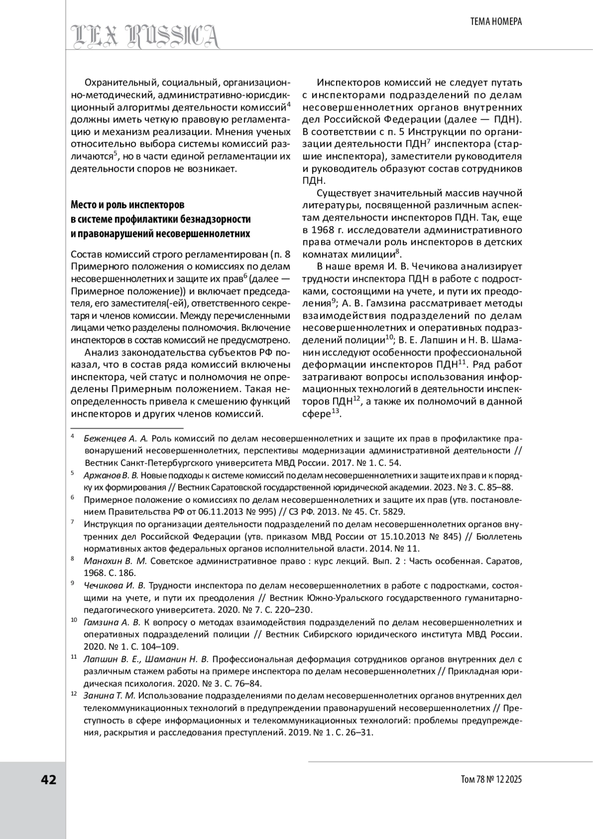 14. Лапшин В. Е., Шаманин Н. В. Профессиональная деформация сотрудников органов внутренних дел с различным стажем работы на примере инспектора по делам несовершеннолетних // Прикладная юридическая психология. 2020. № 3. С. 76-84.