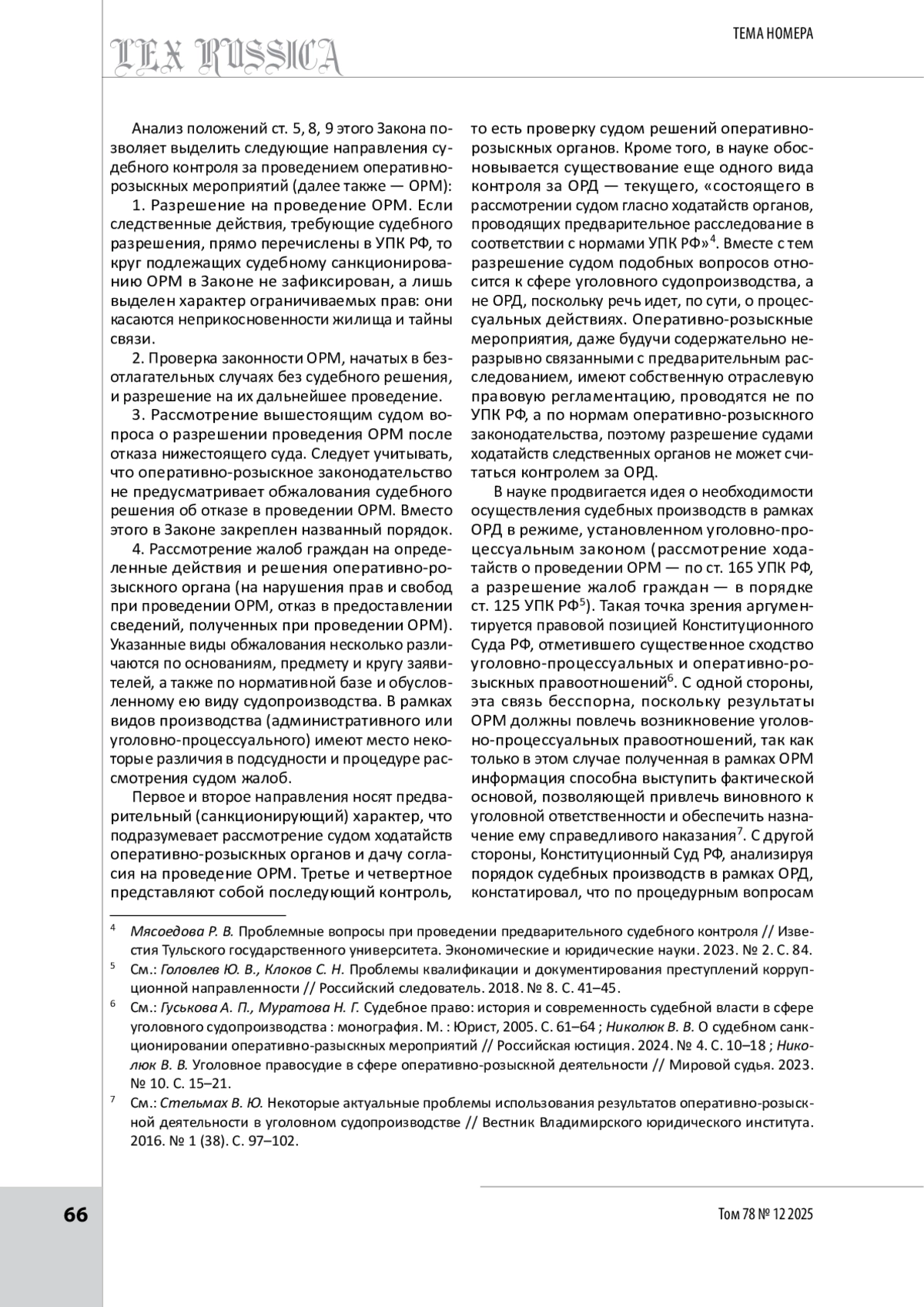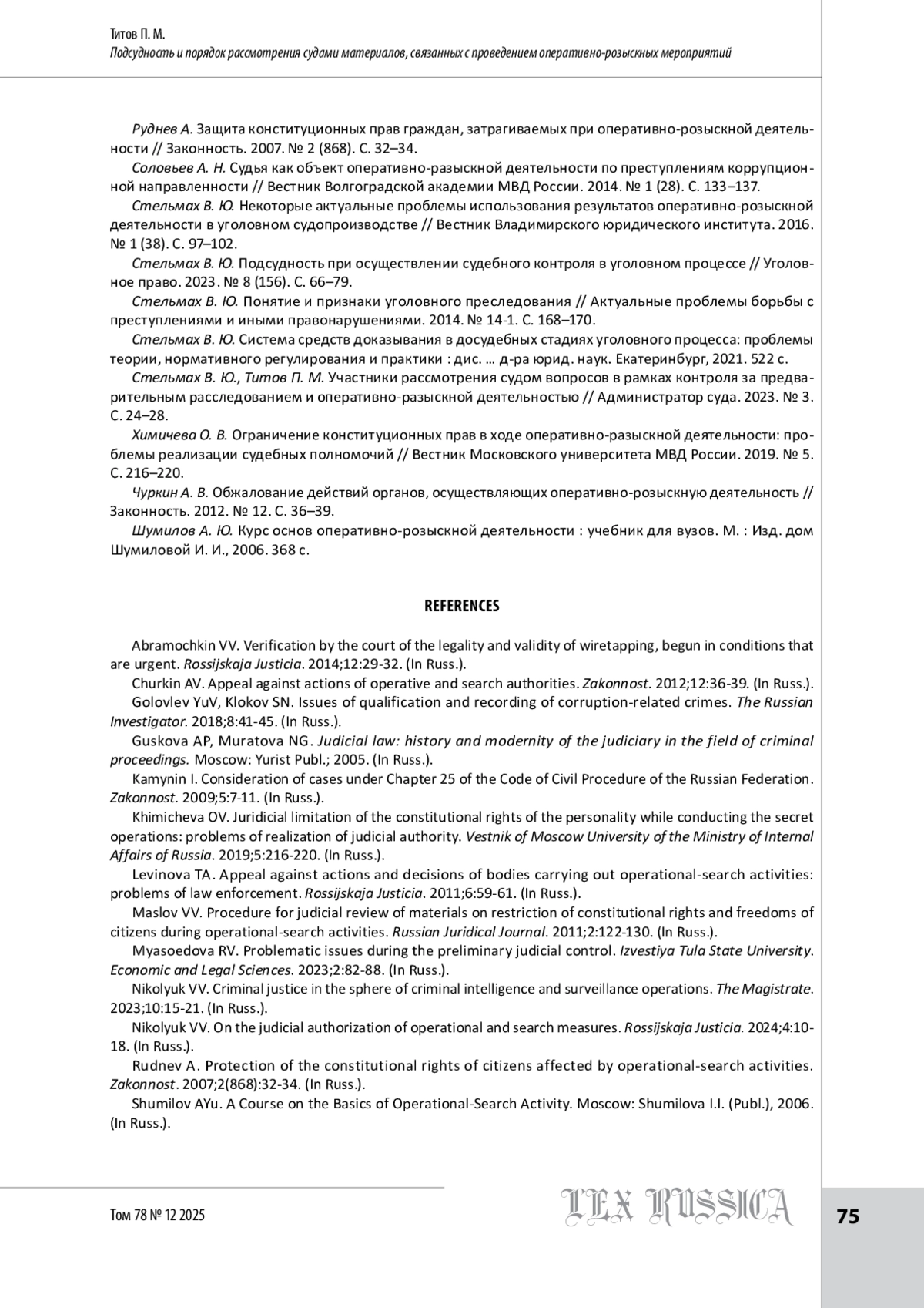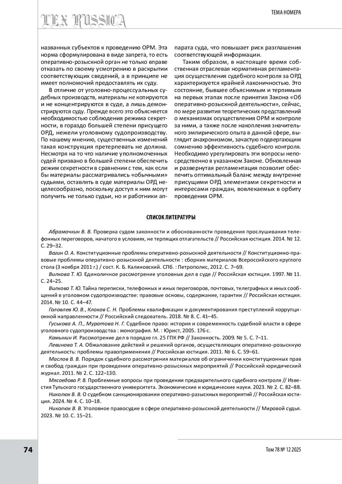 12. Николюк В. В. Уголовное правосудие в сфере оперативно-розыскной деятельности // Мировой судья. 2023. № 10. С. 15-21.