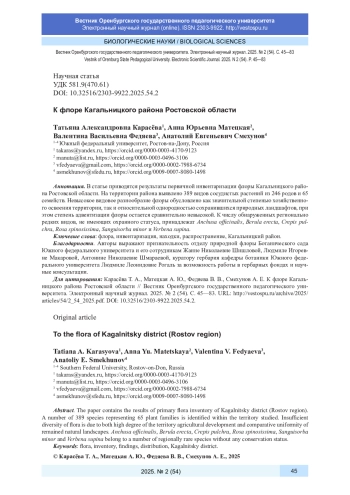 10. Карасева Т. А., Матецкая А. Ю. Раритетный компонент флоры сосудистых растений Кагальницкого района Ростовской области // Степи Северной Евразии: материалы X Междунар. симпозиума (Междунар. степного форума), Оренбург, 27 мая - 2 июня 2024 г. Оренбург: Ин-т степи Уральского отделения РАН, 2024. С. 551-558. DOI: 10.24412/cl-37200-2024-551-558 EDN: VXVPMA