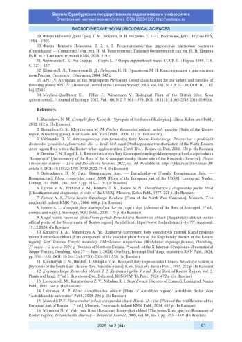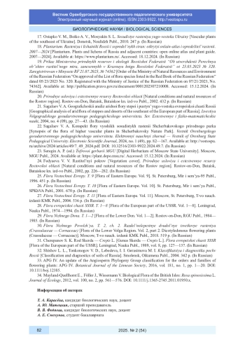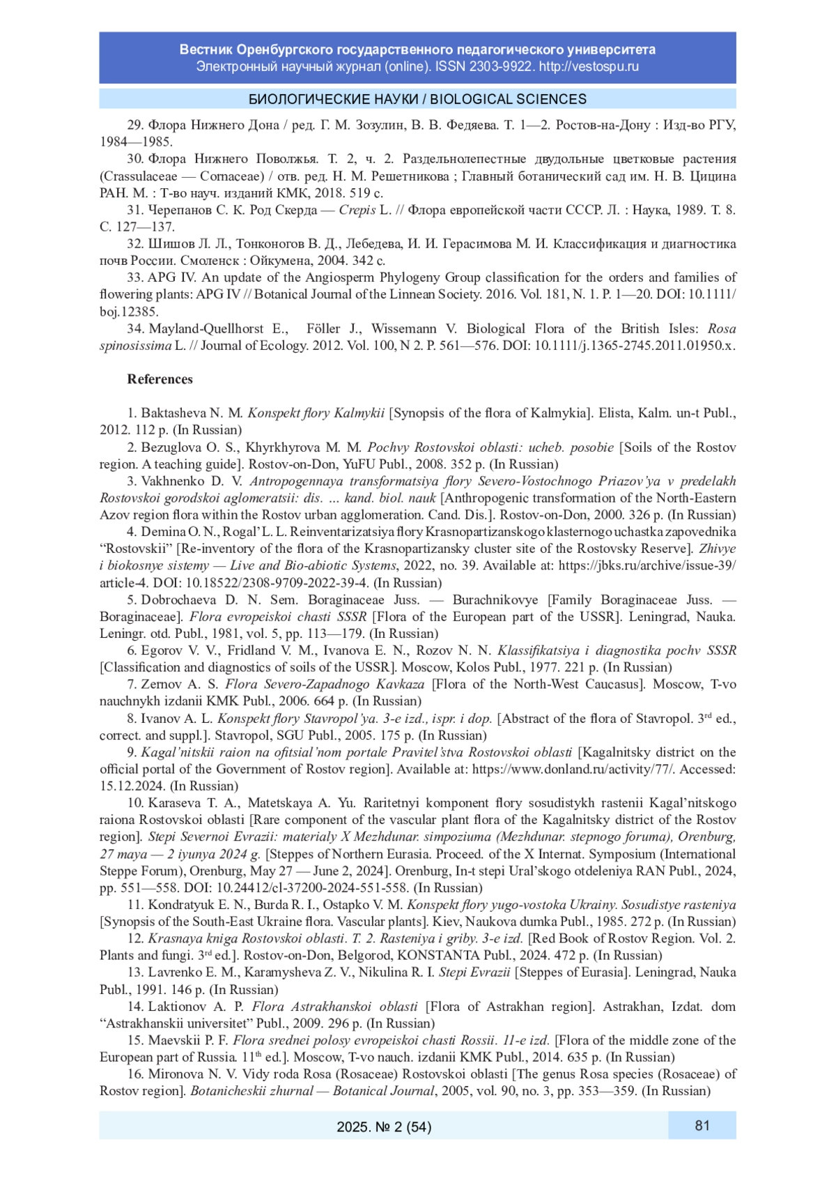 3. Вахненко Д. В. Антропогенная трансформация флоры Северо-Восточного Приазовья в пределах Ростовской городской агломерации: дис. … канд. биол. наук. Ростов-на-Дону, 2000. 326 с. EDN: QDBPYF