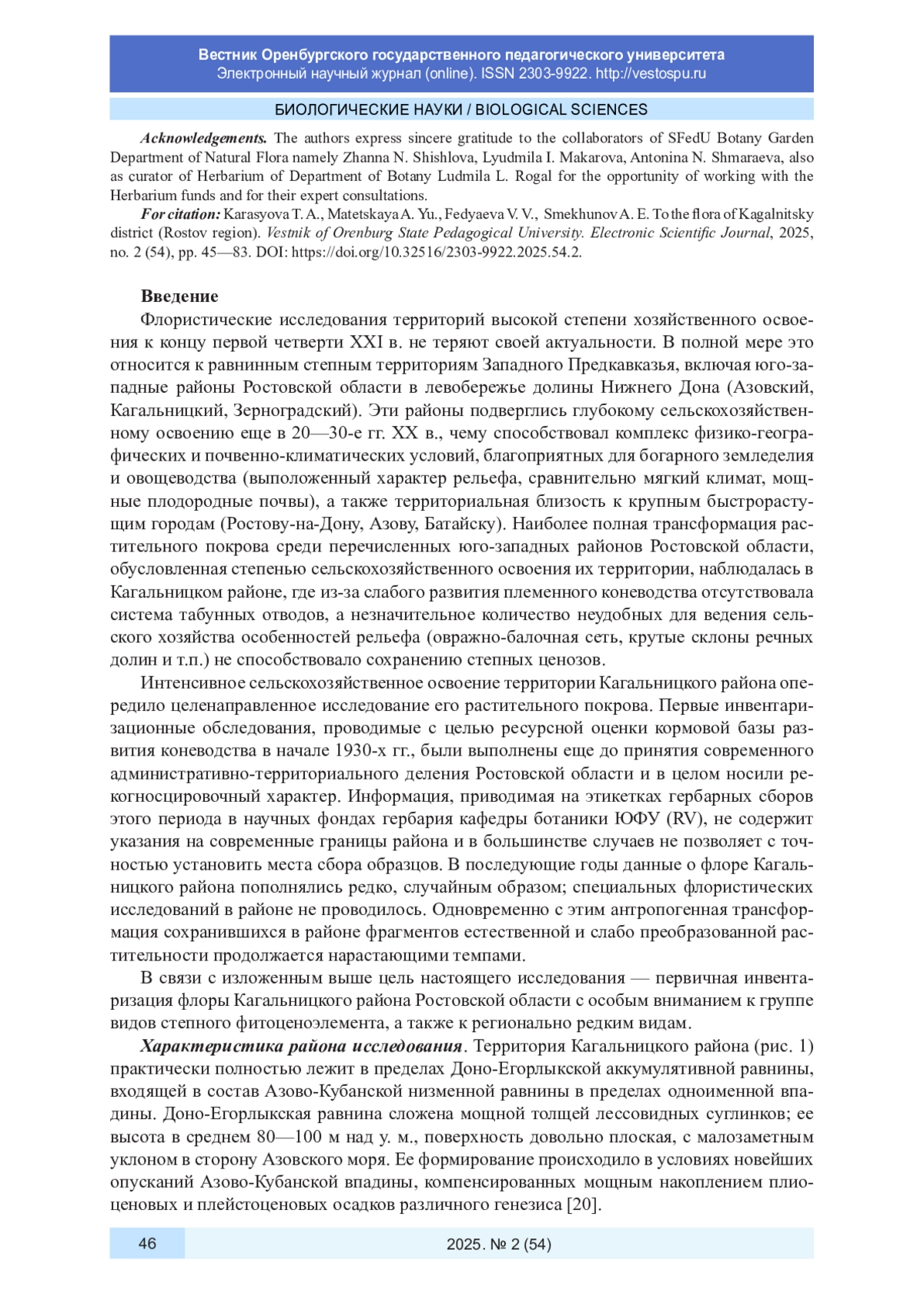 Флористические исследования территорий высокой степени хозяйственного освоения к концу первой четверти XXI в. не теряют своей актуальности. В полной мере это относится к равнинным степным территориям Западного Предкавказья, включая юго-западные районы Ростовской области в левобережье долины Нижнего Дона (Азовский, Кагальницкий, Зерноградский).