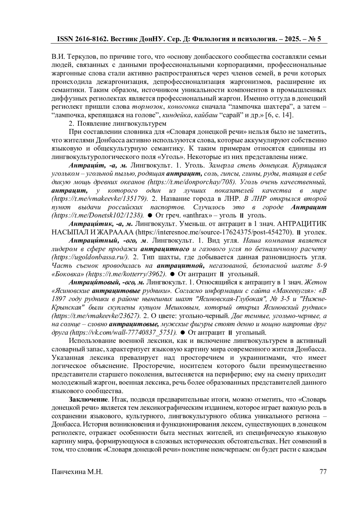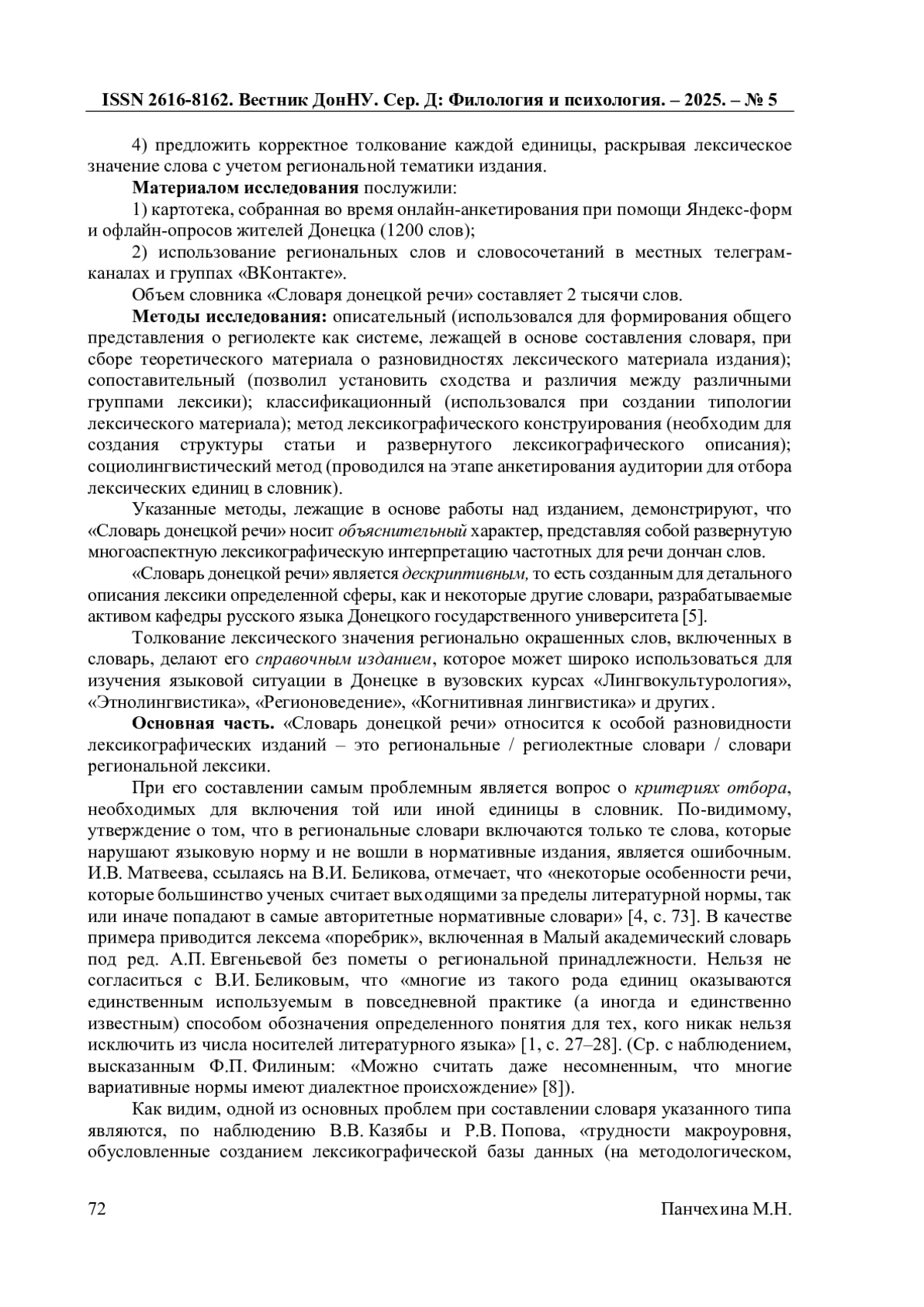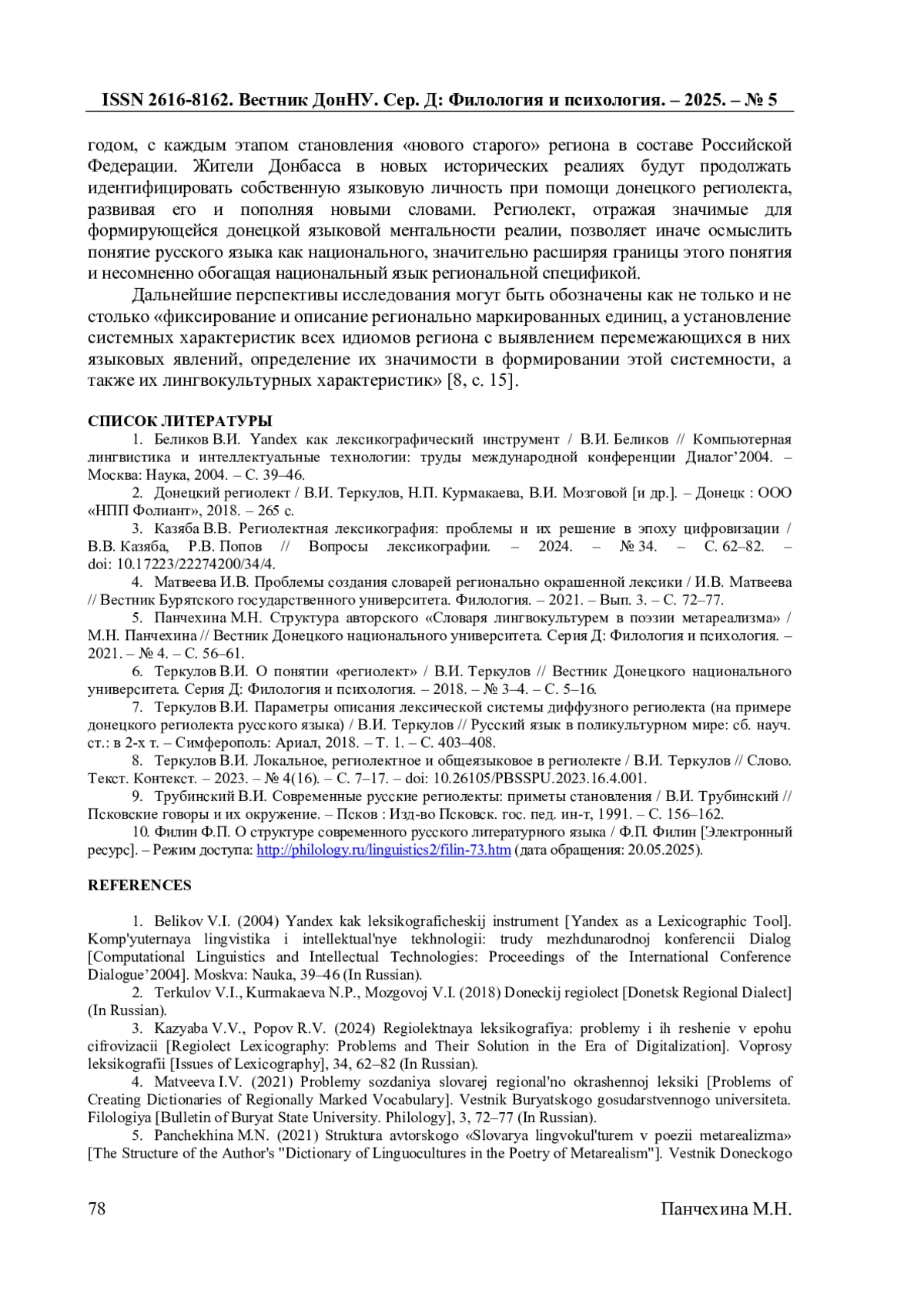 5. Панчехина М.Н. Структура авторского “Словаря лингвокультурем в поэзии метареализма” / М.Н. Панчехина // Вестник Донецкого национального университета. Серия Д: Филология и психология. - 2021. - № 4. - С. 56-61. EDN: UPPREV