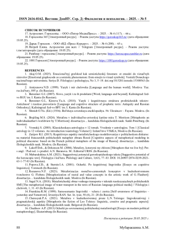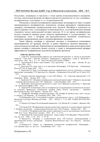 10. Мубаракшина А.М. Суггестивный потенциал гороскопического текста / А.М. Мубаракшина // Филология и культура. Philology and Culture. - 2021. - №1(63). С. 77-83. 10.26907/2074-0239-2021- 63-1-77-83. DOI: 10.26907/2074-0239-2021-63-1-77-83