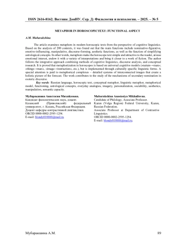 В статье рассматриваются метафоры в современных гороскопических текстах с позиции когнитивной лингвистики. На материале анализа 200 контекстов было установлено, что к числу основных функций относятся номинативно-образная, эмотивно-воздействующая, манипулятивная, дискурсообразующая, эстетическая функции, функция упрощения астрологических концепций. Иными словами, метафоры делают текст гороскопа простым и привлекательными для читателя, вызывают эмоциональный интерес, наделяют его вариативностью трактовок и приближают его к художественному произведению. В работе применяется интегративный подход, сочетающий методы когнитивной лингвистики, дискурс-анализа и концептуальных исследований. Доказано, что метафоризация в гороскопах базируется на универсальных когнитивных моделях («природа → человек»; «вещи → человек», «образ → инструкция» и т. д.), но реализуется через культурно-специфичные языковые формы. Особое внимание уделяется метафорическим комплексам - развернутым системам взаимосвязанных образов, создающим целостную картину прогноза. Работа вносит вклад в изучение механизмоввторичной номинации в эзотерическом дискурсе.