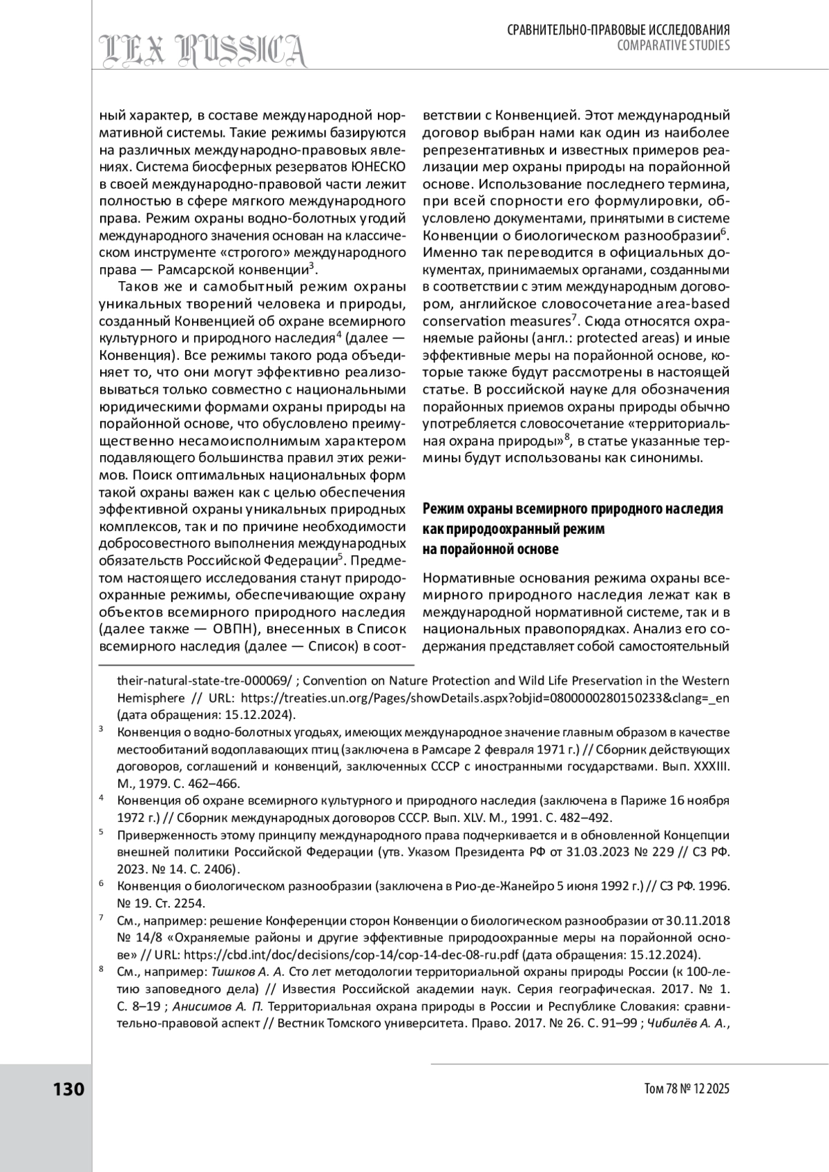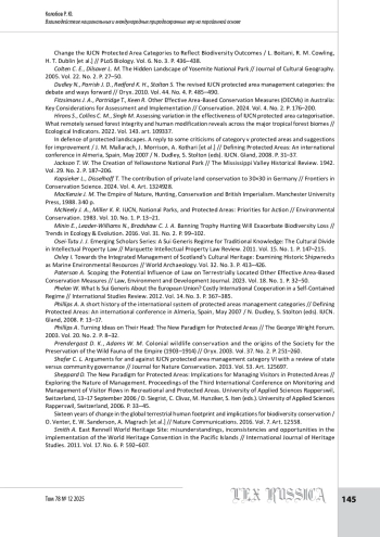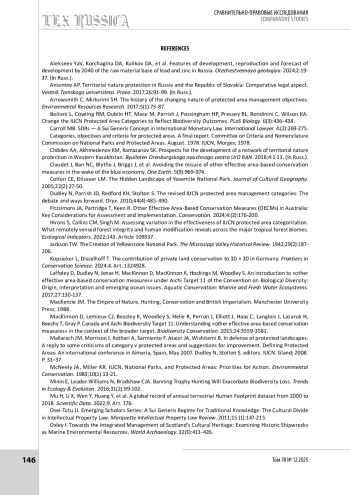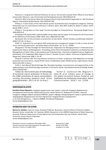 27. Paterson A. Scoping the Potential Influence of Law on Terrestrially Located Other Effective Area-Based Conservation Measures // Law, Environment and Development Journal. 2023. Vol. 18. No. 1. P. 32-50.