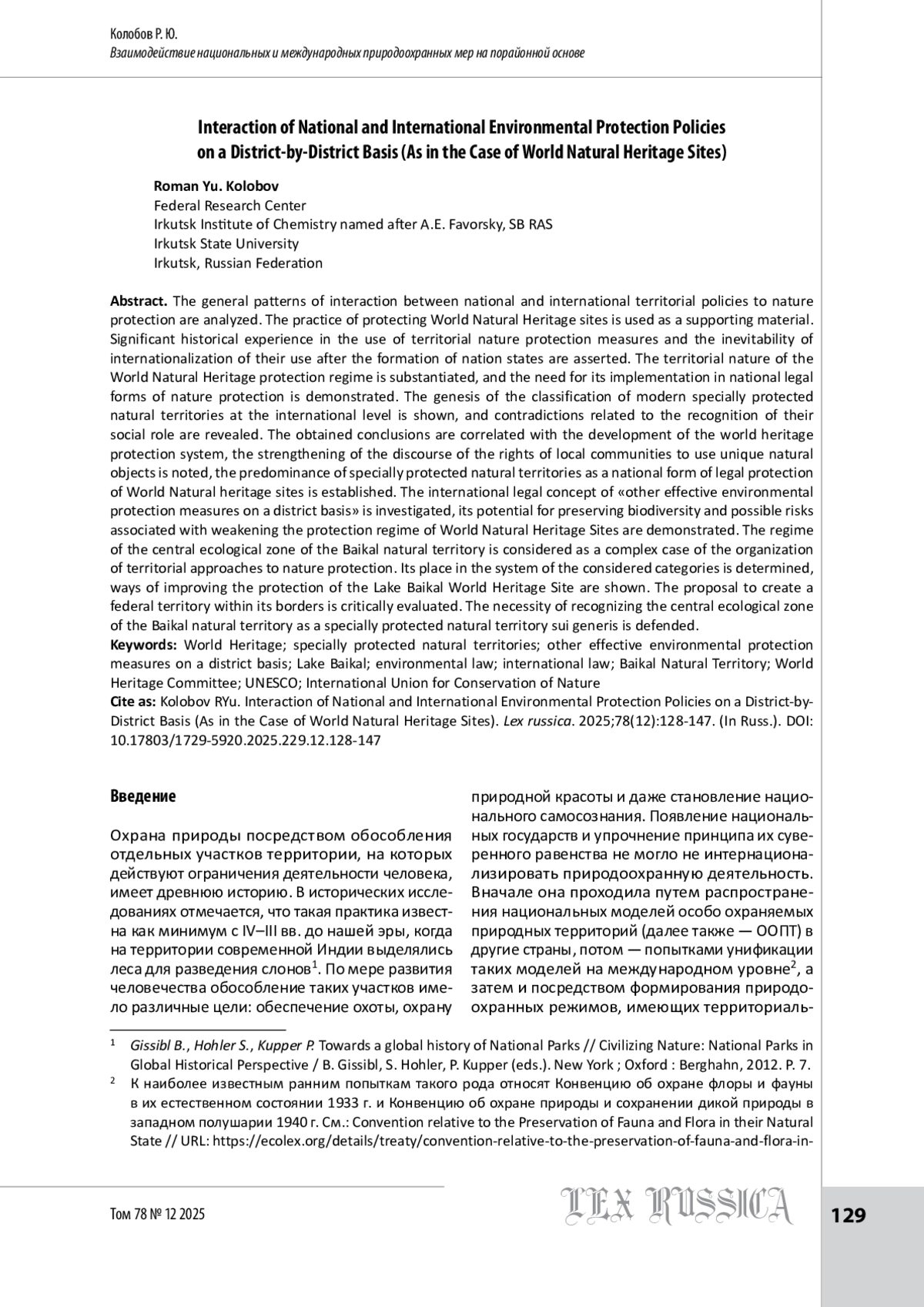 Анализируются общие закономерности взаимодействия национальных и международных территориальных подходов к охране природы. В качестве иллюстративного материала представлена практика охраны объектов всемирного природного наследия. Констатируется значительный исторический опыт в использовании территориальных мер охраны природы и неизбежность интернационализации их использования после формирования национальных государств. Обосновывается территориальный характер режима охраны всемирного природного наследия, демонстрируется необходимость его реализации в национально-правовых формах охраны природы. Показан генезис классификации современных особо охраняемых природных территорий на международном уровне, выявлены противоречия, связанные с признанием их социальной роли. Полученные выводы соотнесены с развитием системы охраны всемирного наследия, констатировано усиление дискурса прав местных сообществ на использование уникальных природных объектов, установлено преобладание особо охраняемых природных территорий как национальной формы правовой охраны объектов всемирного природного наследия. Исследовано международно-правовое понятие «другие эффективные природоохранные меры на порайонной основе», продемонстрирован его потенциал для сохранения биоразнообразия и оценены возможные риски, связанные с ослаблением режима охраны объектов всемирного природного наследия. Как пример сложного случая организации территориальных подходов к охране природы рассмотрен режим центральной экологической зоны Байкальской природной территории. Определено его место в системе анализируемых категорий, показаны способы совершенствования охраны объекта всемирного наследия «Озеро Байкал», критически оценивается предложение о создании федеральной территории в его границах. Отстаивается необходимость признания центральной экологической зоны Байкальской природной территории особо охраняемой природной территорией sui generis.