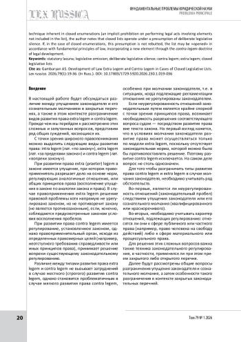 В статье рассматриваются малоизученные вопросы теории права: молчание законодателя, закрытые законодательные перечни, а также «открытие» этих списков с помощью доктрины contra legem или восполнение посредством доктрины extra legem. В целях уточнения терминов автор выделяет два проявления законодательного молчания (законодательного пробела): упущение и сознательное молчание законодателя. Законодательный пробел является не только следствием упущения, но и результатом сознательного молчания законодателя. В статье выдвигается идея презумпции законодательного упущения, согласно которой если отсутствуют фактические данные о сознательном неурегулировании отношений законодателем, то необходимо исходить из опровергаемой презумпции, что неурегулирование этих отношений стало следствием упущения (ошибки) законодателя. Презумпцию законодательного упущения можно опровергнуть фактическими данными, подтвердив сознательное молчание законодателя. В условиях презумпции законодательного упущения этот пробел восполняется на основе доктрины развития права extra legem. Иная ситуация с закрытыми списками. Автор, имея в виду специфику техники закрытых перечней (имплицитный запрет на совершение юридических действий с неперечисленными элементами), отмечает, что в случае закрытых списков действует не презумпция законодательного упущения, а презумпция сознательного молчания законодателя. Если в случае с закрытыми перечнями презумпция сознательного молчания законодателя не была опровергнута, то этот список можно «открыть» по велению принципов права и включить в него новый элемент на основе доктрины развития права contra legem.