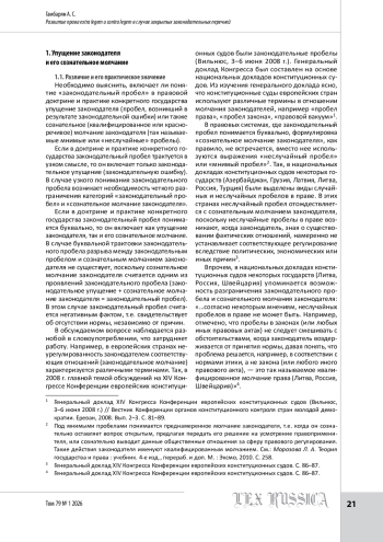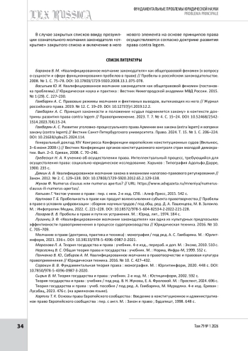 1. Баранов В. М. «Квалифицированное молчание законодателя» как общеправовой феномен (к вопросу о сущности и сфере функционирования пробелов в праве) // Пробелы в российском законодательстве. 2008. № 1. С. 75-78. https://doi.org/10.17803/1729-5920.2008.13.1.075-078.