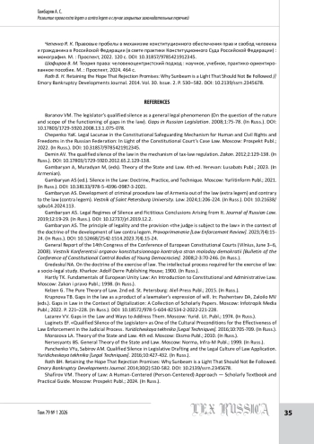 3. Гамбарян А. С. Правовые режимы молчания и фиктивных выводов, вытекающих из него // Журнал российского права. 2019. № 12. С. 19-29. https://doi.org/10.12737/jrl.2019.12.2.