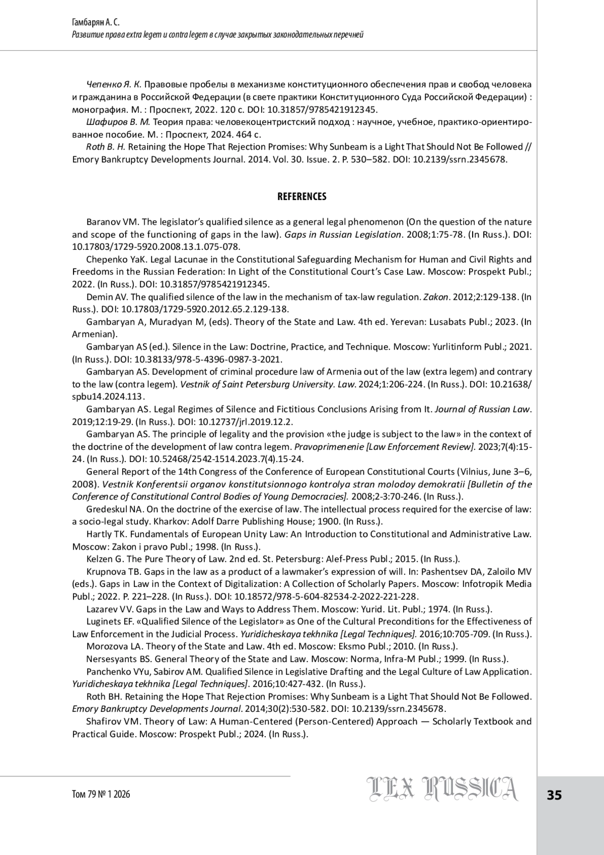 4. Гамбарян А. С. Принцип законности и положение «судья подчиняется закону» в контексте доктрины развития права contra legem // Правоприменение. 2023. Т. 7. № 4. С. 15-24. https://doi.org/10.52468/2542- 1514.2023.7(4).15-24.
