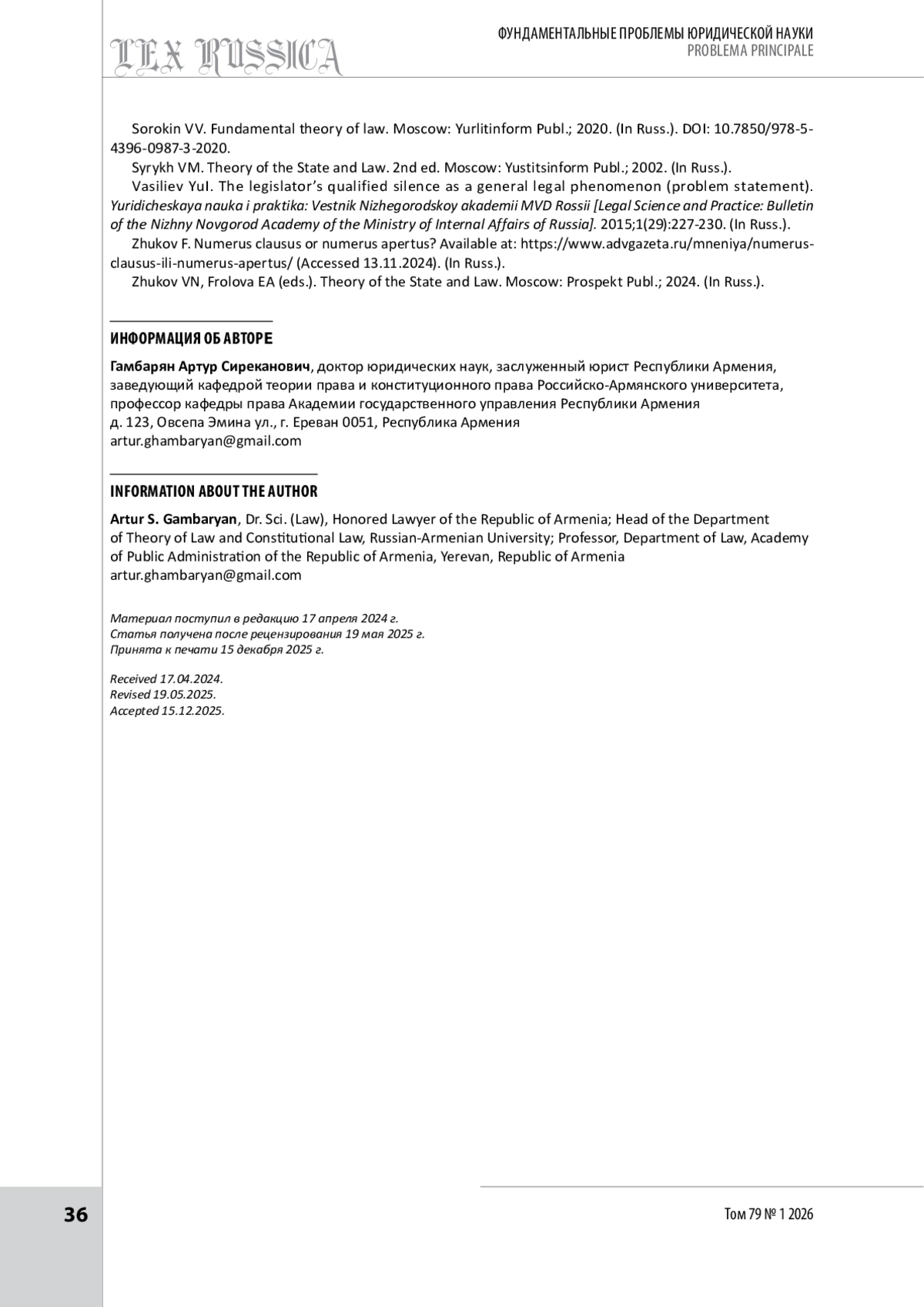 5. Гамбарян А. С. Развитие уголовно-процессуального права Армении вне закона (extra legem) и вопреки закону (contra legem) // Вестник Санкт-Петербургского университета. Право. 2024. Т. 15. № 1. С. 206-224. https://doi.org/10.21638/spbu25.2024.114.