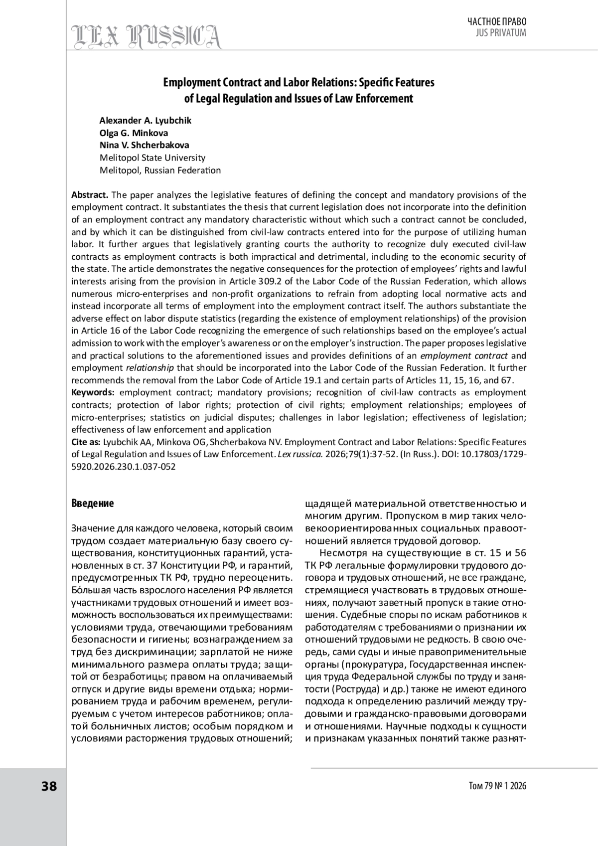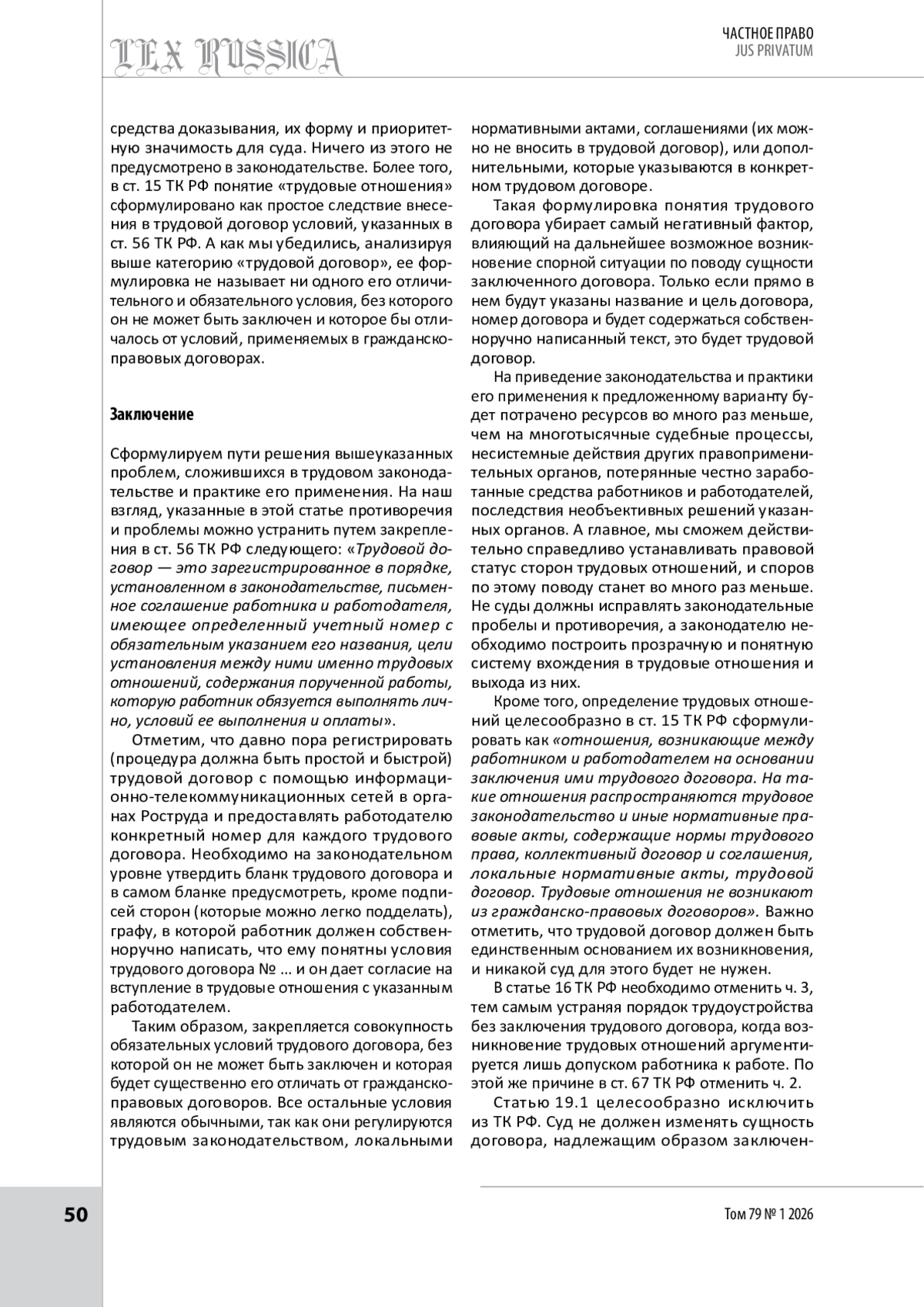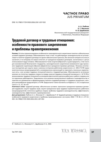 В статье проанализированы особенности законодательного закрепления понятия и обязательных условий трудового договора. Обосновывается тезис о том, что действующее законодательство не устанавливает в понятии трудового договора ни одного обязательного признака, без внесения которого его нельзя заключить и по которому его можно отличить от гражданско-правовых договоров, заключаемых с целью использования труда человека. Обосновывается также нецелесообразность и даже вредность, в том числе для экономической безопасности государства, законодательного закрепления возможности суда признавать трудовыми надлежащим образом оформленные гражданско-правовые договоры. Показаны негативные последствия для защиты прав и законных интересов работников закрепления в ст. 309.2 ТК РФ права многочисленных микропредприятий и некоммерческих организаций не принимать локальные нормативные акты, а все условия трудовых отношений вносить в трудовой договор. Обосновывается негативное влияние на статистику трудовых споров по поводу наличия трудовых отношений положения ст. 16 ТК РФ о возникновении трудовых отношений на основании фактического допуска работника к работе с ведома или по поручению работодателя. Предложены пути решения вышеуказанных проблем в законодательстве и практике его применения и сформулированы понятия «трудовой договор» и «трудовые отношения», которые целесообразно предусмотреть в ТК РФ. Предлагается также исключить из Кодекса ст. 19.1 и отдельные части ст. 11, 15, 16 и 67.