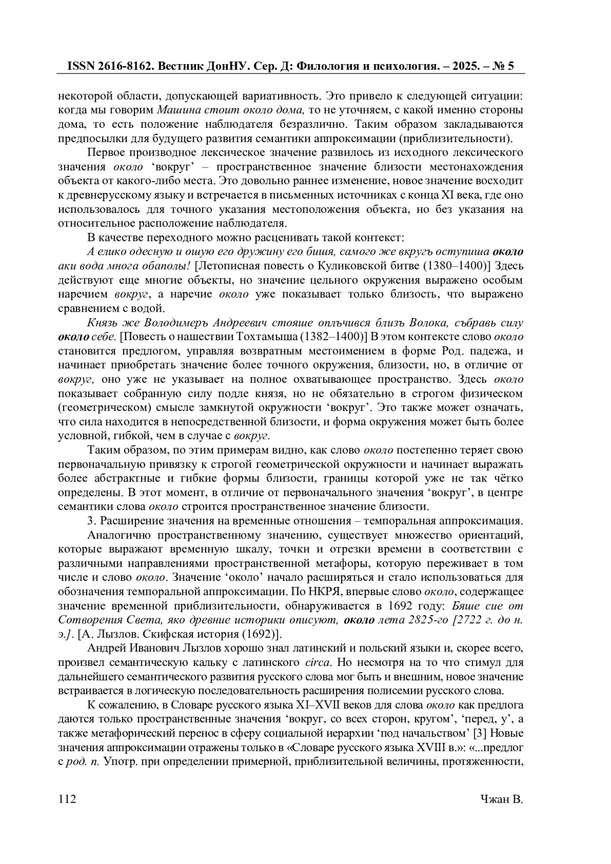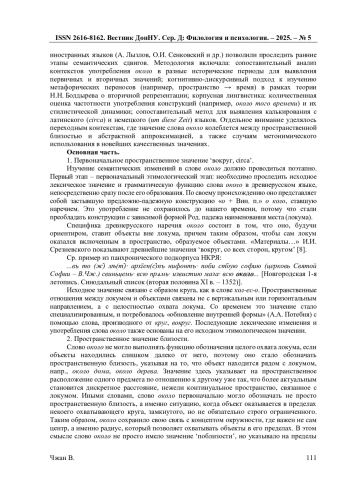 Слово около прошло ряд лексико-грамматических и лексико-семантических изменений, расширявших и уточнявших его значения и сферу употребления. Первоначально это слово имело узко направленное значение, связанное с пространственной близостью, но с течением времени его семантика обогатилась, включая как пространственные, так и временные, количественные значения и значение приблизительности. На его семантическое развитие и изменения повлияло множество факторов, таких как тенденции в самом языке, изменения в социальной среде и менталитете носителей языка, а также влияние латинского и немецкого языков. В данной статье будут рассмотрены основные этапы изменения в значении и употреблении слова около и современные когнитивные механизмы его понимания и восприятия в качестве аппроксиматора.