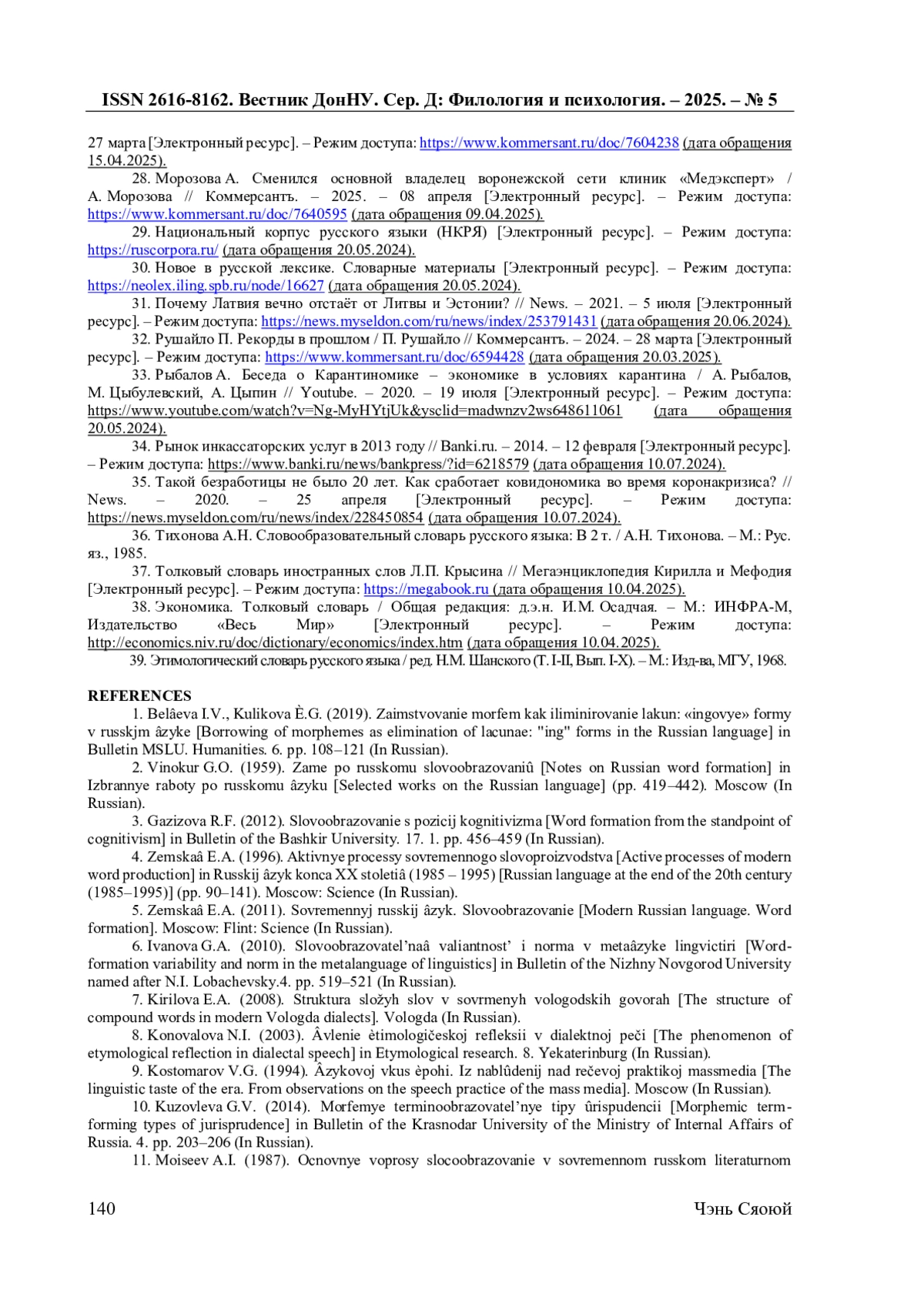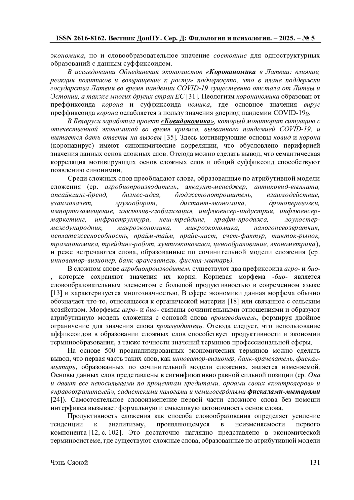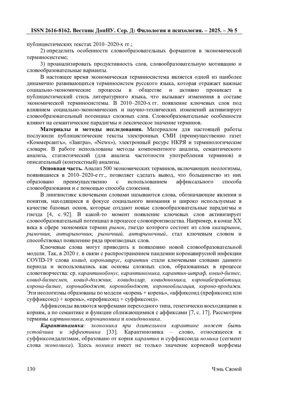 В работе рассматриваются словообразовательные особенности экономических терминов в публицистических текстах 2010-2020-х гг. (преимущественно в газетах «Коммерсантъ», «Завтра», «News»), включая неологизмы, которые появляются в это время, проанализированы их продуктивность, словообразовательная мотивация и словообразовательные варианты. Экономическая терминология формируется под влиянием тенденции к интернационализации терминологической лексики, а также к ее адаптивности и точности, что проявляется в использовании при образовании экономических терминов заимствованных и русских морфем, включая суффиксы, выражающие абстрактные значения. В терминообразовании экономической сферы регулярность и повторяемость словообразовательных формантов обеспечивают осуществление номинативной функции языка, ясность и точность обозначения экономического явления или понятия. В процессе исследования применялись метод компонентного анализа, метод семантического анализа, статистический (для анализа частотности употребления терминов) и описательный (контекстный) анализы.