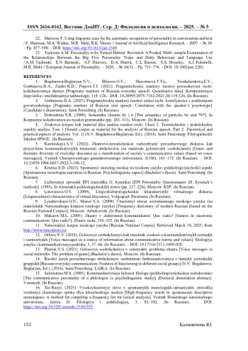 22. Mairesse F. Using linguistic cues for the automatic recognition of personality in conversation and text / F. Mairesse, M.A. Walker, M.R. Mehl, R.K. Moore // Journal of Artificial Intelligence Research. - 2007. - № 30. - Pp. 457-500. -. DOI: 10.1613/jair.2349