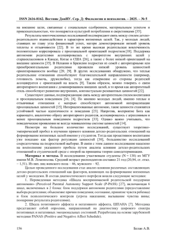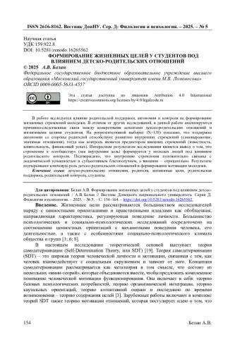 В работе исследуется влияние родительской поддержки, автономии и контроля на формирование жизненных стремлений молодежи. В отличие от других исследований, в данной работе анализируются причинно-следственные связи между конкретными аспектами детско-родительских отношений и жизненными целями студентов. На репрезентативной выборке (N=138) показано, что поддержка автономии со стороны родителей способствует развитию внутренних стремлений (самовыражение, значимые отношения), тогда как контроль является предиктором внешних стремлений (известность, влиятельность, финансовый успех). Интересным результатом исследования является вывод о том, что стремление к «сообществу» (как внутренняя цель) формируется у молодых людей под влиянием родительского контроля. Подтверждено, что внутренние стремления положительно связаны с академической успешностью и субъективным благополучием, а внешние - отрицательно. Результаты подчеркивают ключевую роль детско-родительских отношений в формировании мотивации молодежи.