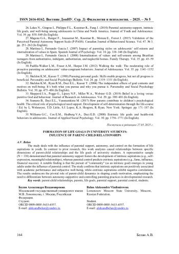 26. Lekes N. Parental autonomy-support, intrinsic life goals, and well-being among adolescents in China and North America / N. Lekes, I. Gingras, F.L. Philippe, R. Koestner, J. Fang // Journal of Youth and Adolescence. - 2010. - Vol. 39. - P. 858-869. EDN: NAMVIB